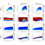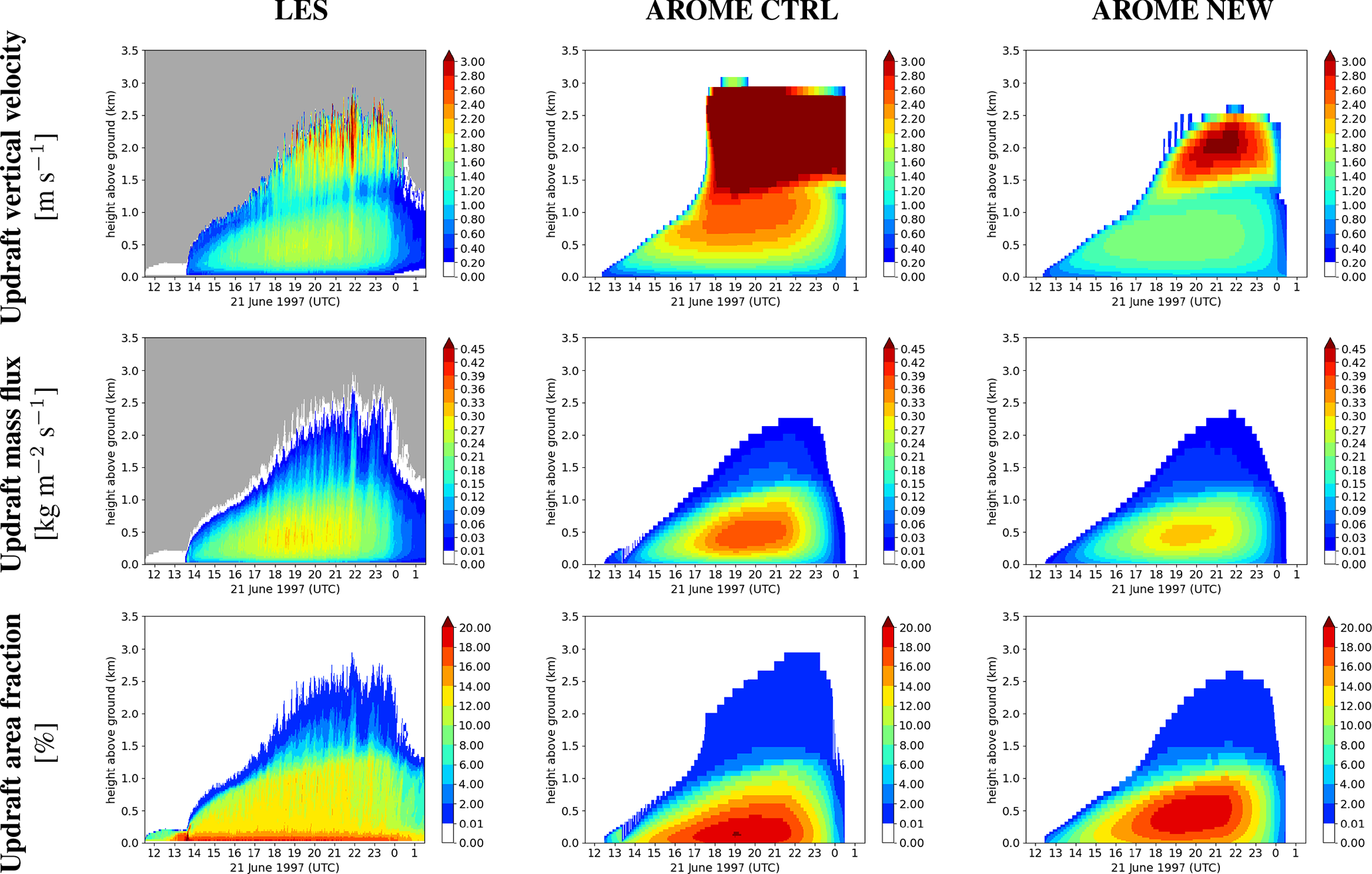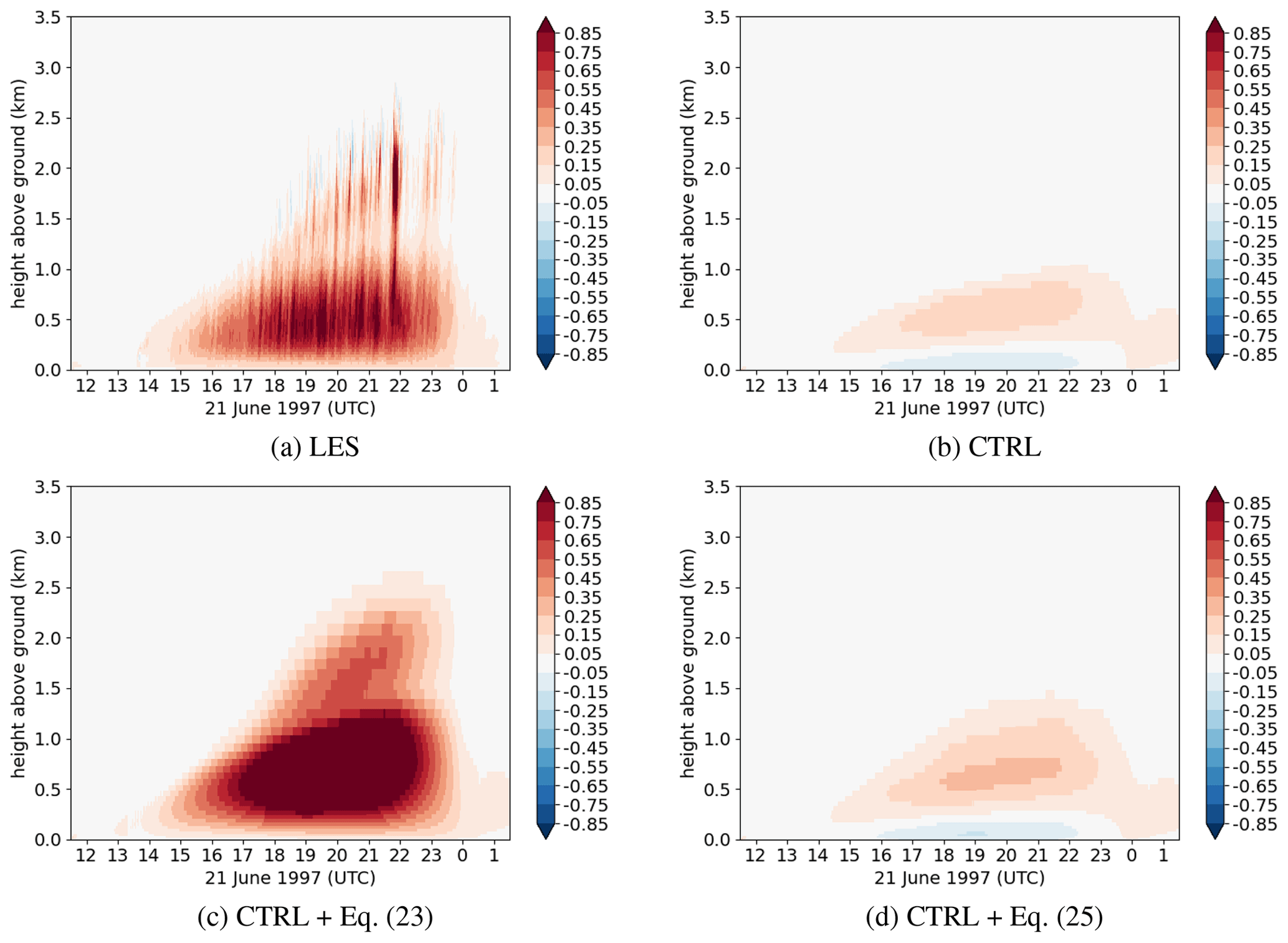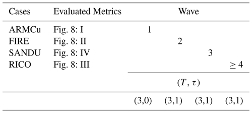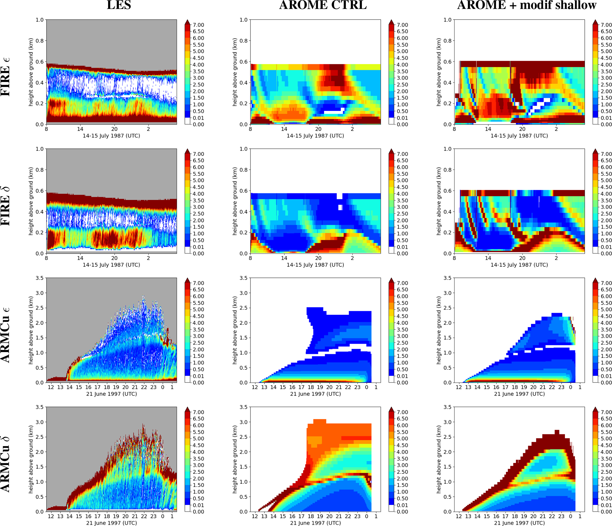 For the LES, fractional entrainment and detrainment are calculated using the Couvreux et al. (2009) conditional sampling, with the help of Eq. (3). For the ARMCu case, δ discontinuities are removed at 13:00 UTC, while the diurnal cycle of the wet part is improved for both the entrainment and detrainment rates in comparison to the CTRL experiment. However, entrainment seems slightly underestimated in the cloud. The result is less clear for the FIRE case, as the sum of the entrainment and detrainment rates is overestimated, even though the entrainment of the cloud top is improved for the whole simulation. It seems that compensating subsidence of dry air into the ABL deteriorates both quantities in the stratocumulus cloud. In both cases, the modified formulations appear to slightly improve the representation of both quantities.