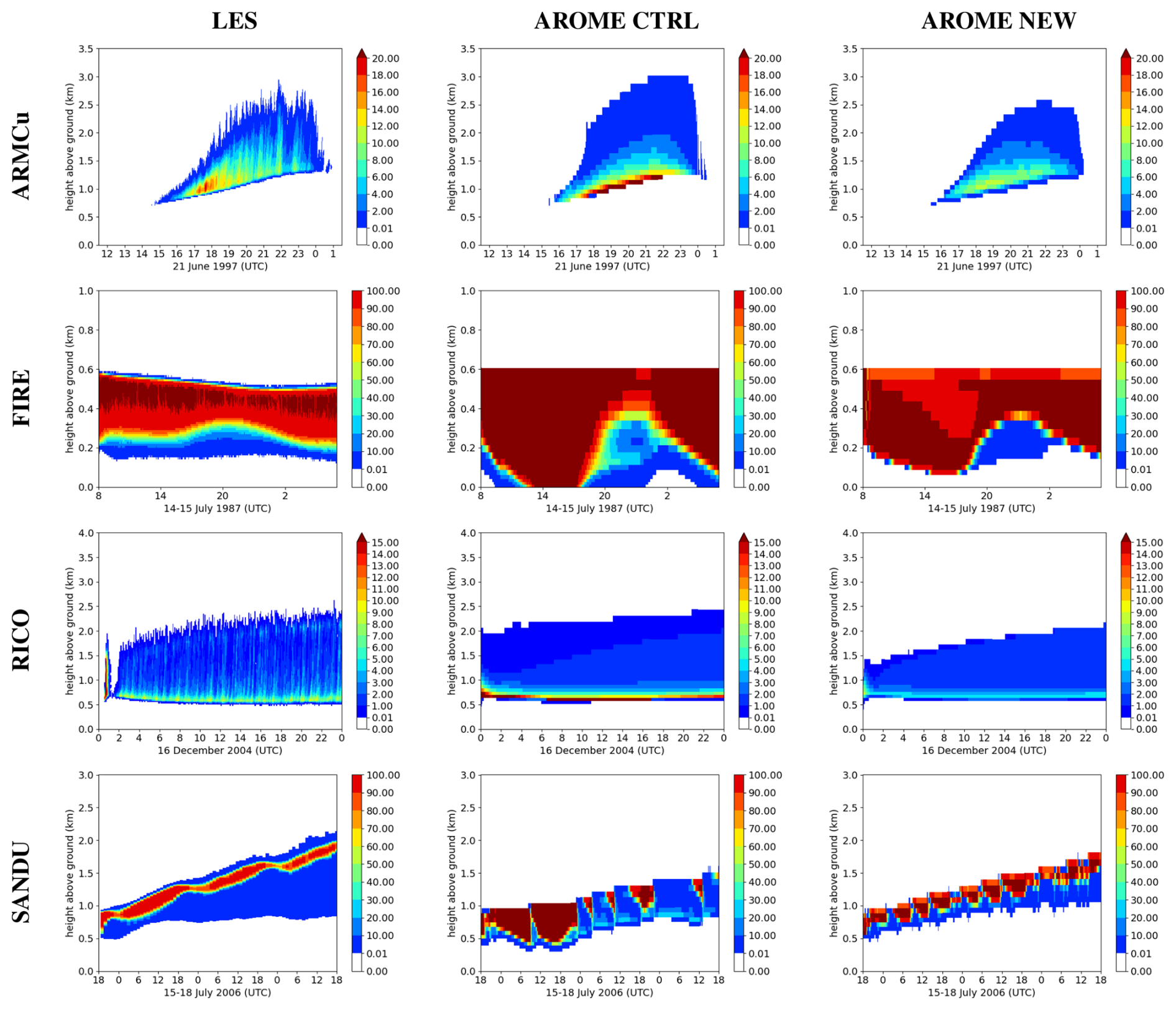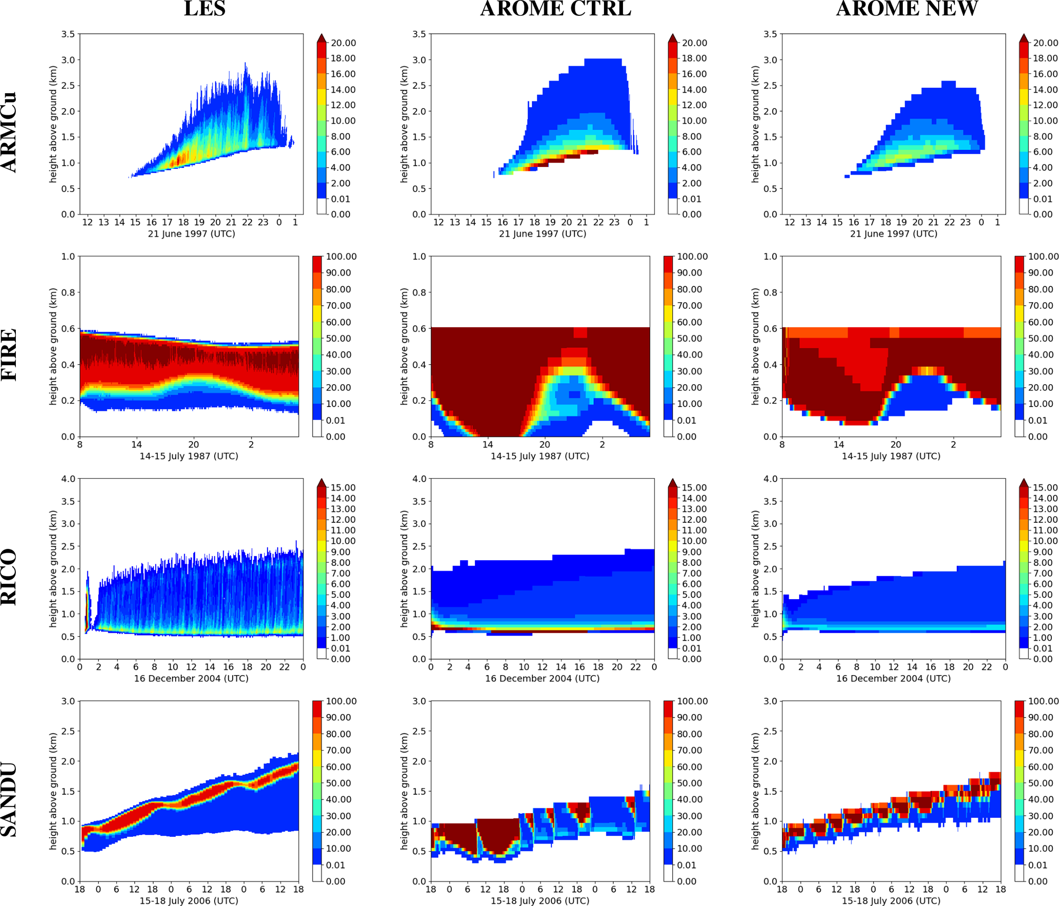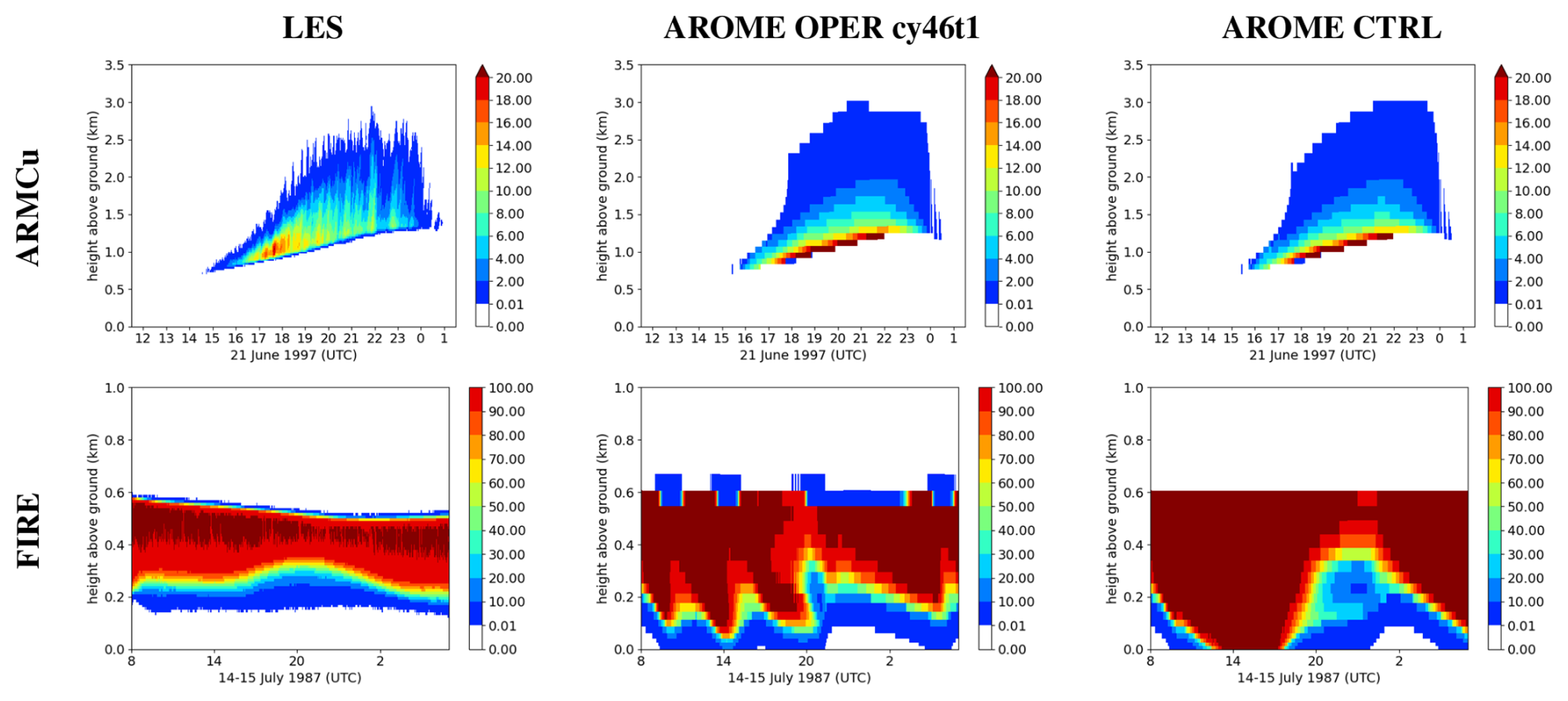 Figure 1Temporal evolution of the vertical profiles of cloud fraction (CF) [%] for the ARMCu case (first line), and the FIRE case (second line) with the LES (first column), the operational AROME version (second column), and the CTRL reference experiment (third column).