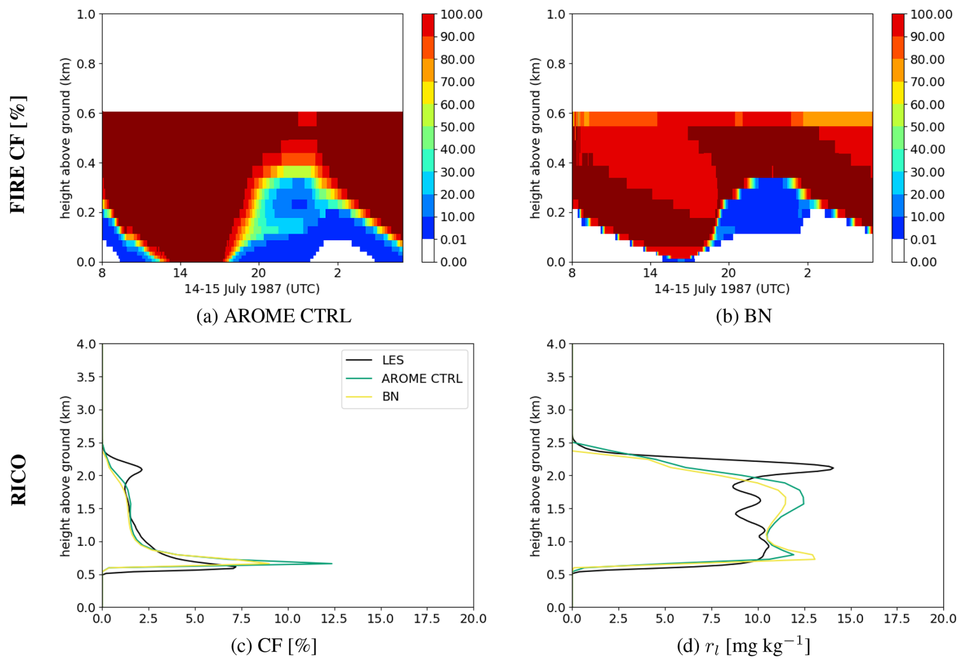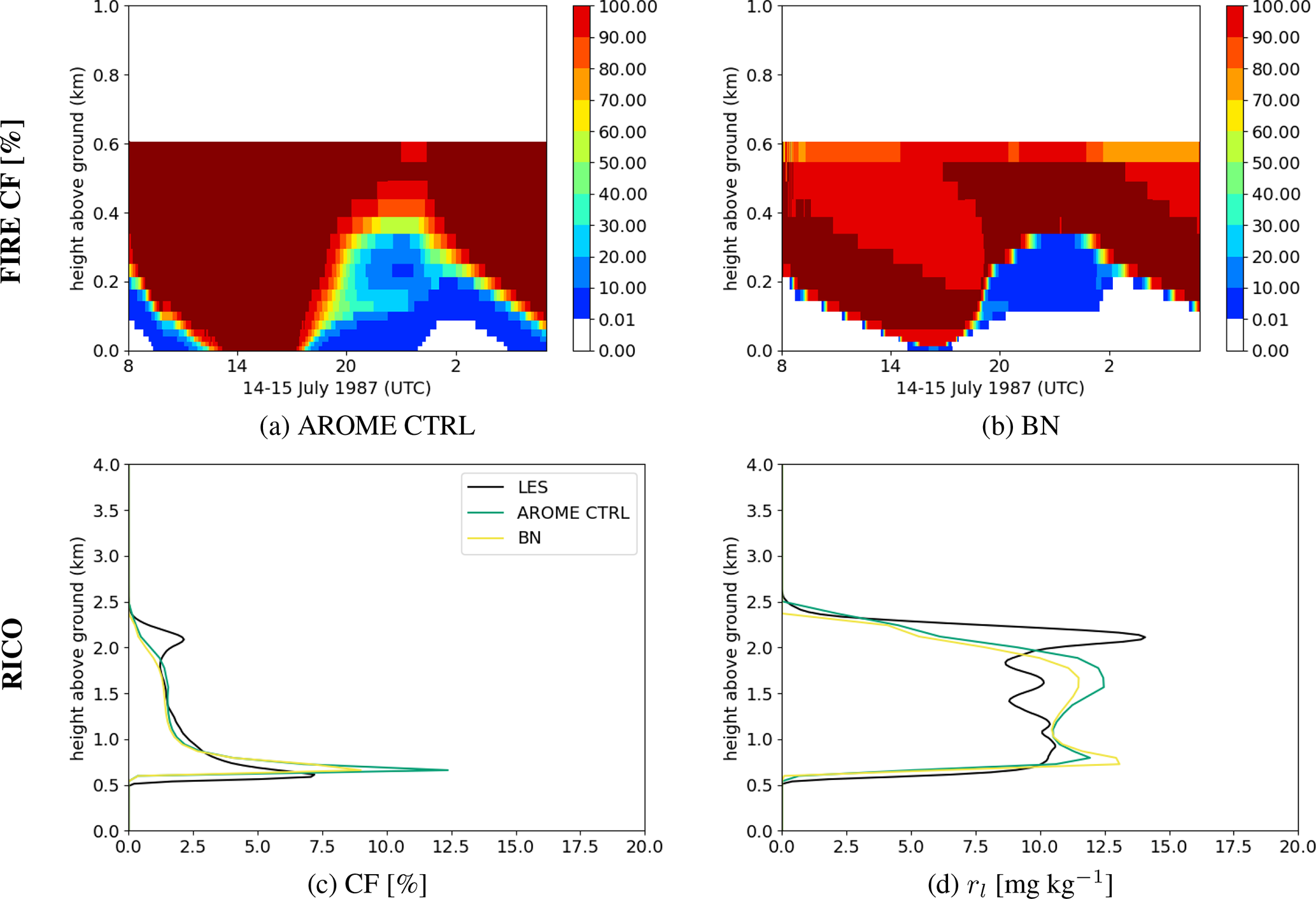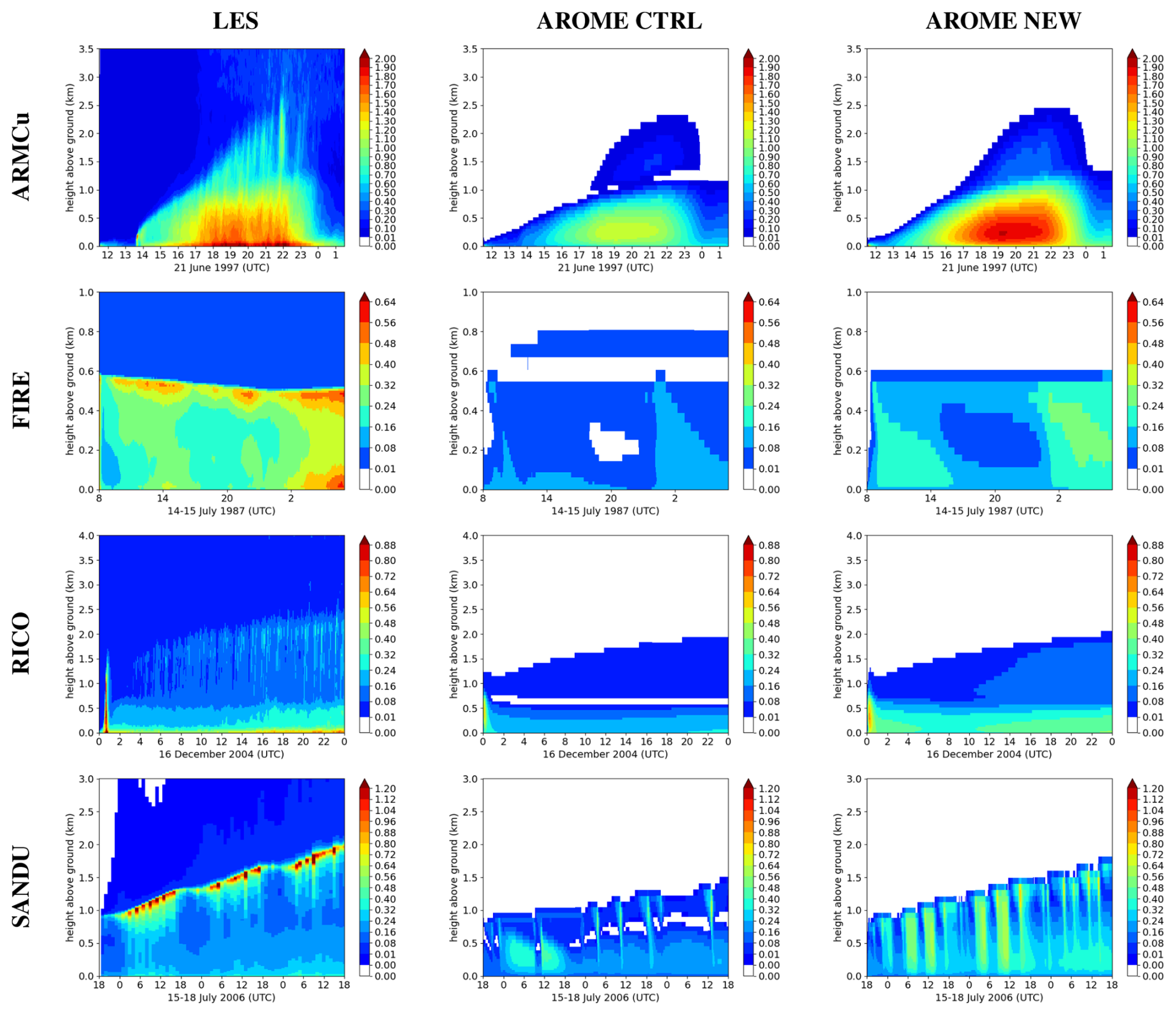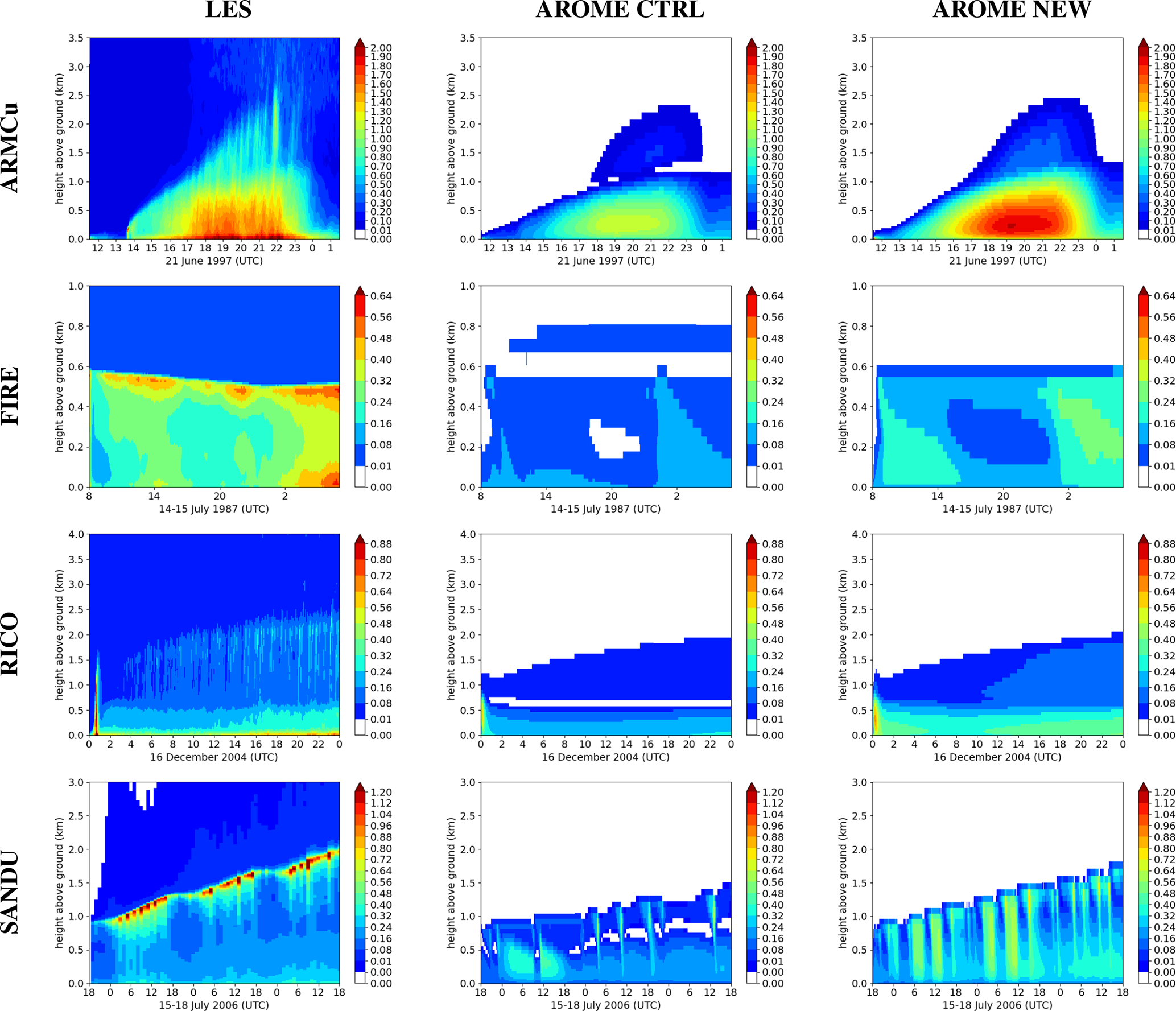 Figure 1Temporal evolution of the vertical profiles of cloud fraction (CF) [%] for the ARMCu case (first line), and the FIRE case (second line) with the LES (first column), the operational AROME version (second column), and the CTRL reference experiment (third column).