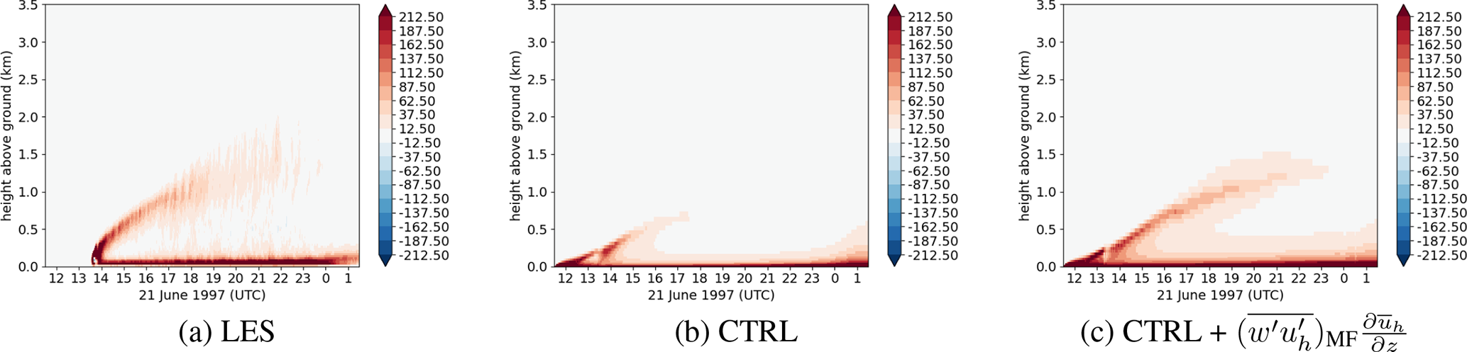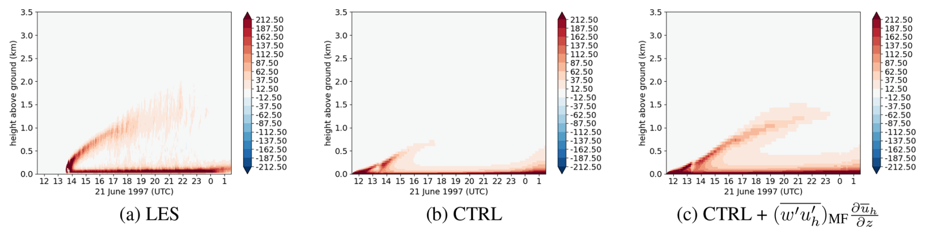 Historically, several approaches have been used for this purpose. One popular and simple design is the K-gradient closure, which aims to describe small-scale turbulence in the form of isotropic eddies. This approach works relatively well at resolutions outside the ABL turbulence spectrum, e.g. at coarse mesoscale resolution or at the LES scale. However, at kilometric and mostly sub-kilometric horizontal resolution (“Terra Incognita” for shallow convection in Wyngaard2004), it does not work very well to reproduce the ABL counter-gradient regions. Later, Deardorff (1966) introduced a modified K-gradient formulation using a counter-gradient constant, which is very easy to use in practice and has shown relatively good but inherently limited performance. Such a simple closure presents physical and conceptual deficiencies (Zhou et al.2018), especially in the upper part of the ABL. For atmospheric modeling, more sophisticated Higher-Order Closures (HOC) are popular and employed as well (e.g., Mellor and Yamada1974; Canuto et al.1994; Tomas and Masson2006). In practice, HOC schemes can be applied to a wide variety of ABL configurations, one example is the CLUBB scheme (Cloud Layers Unified By Binormals, Golaz et al.2002a, b; Larson and Golaz2005) used in both CESM2 (Danabasoglu et al.2020) and E3SM (Rasch et al.2019) models. However, these formulations are more complex and computationally expensive.