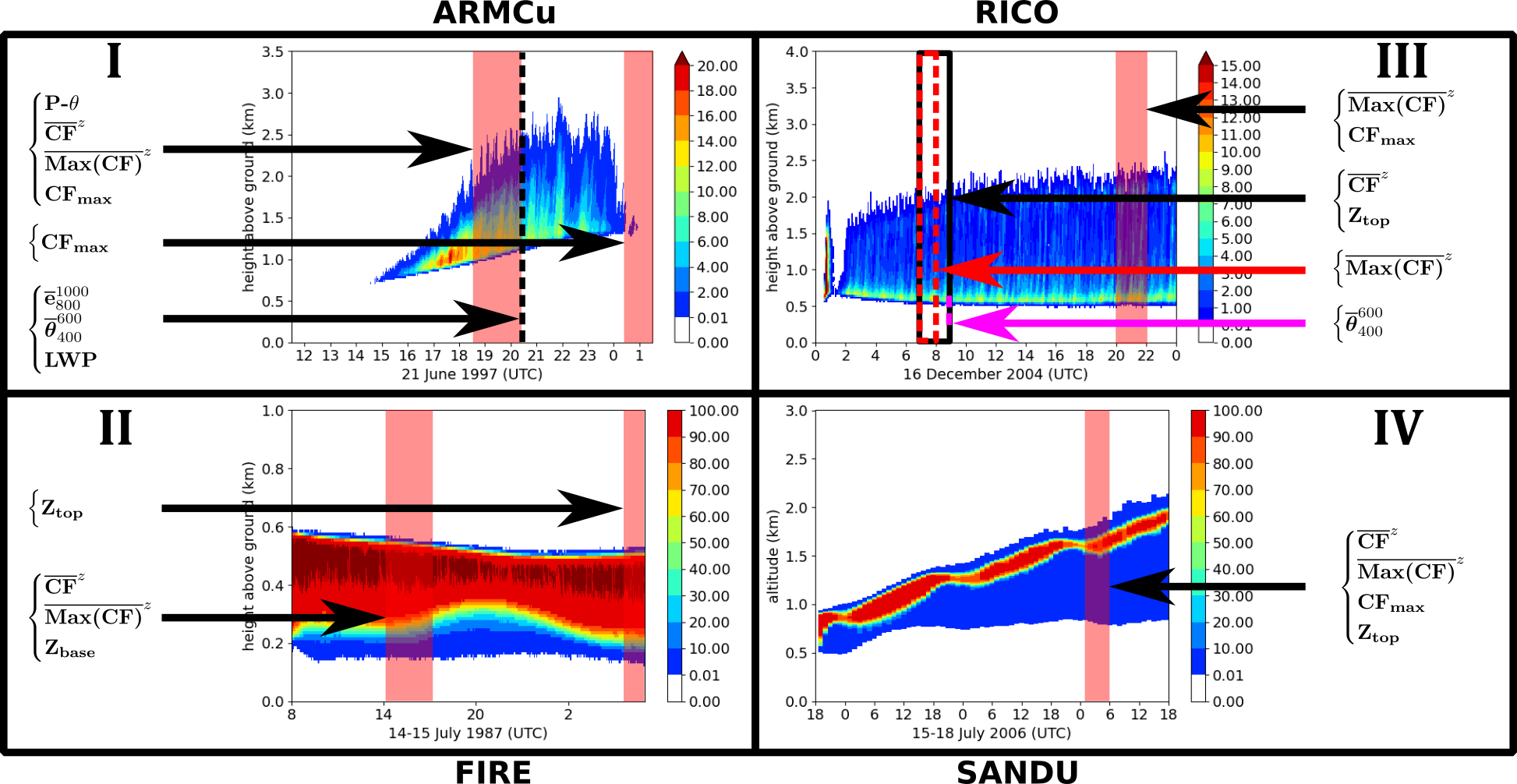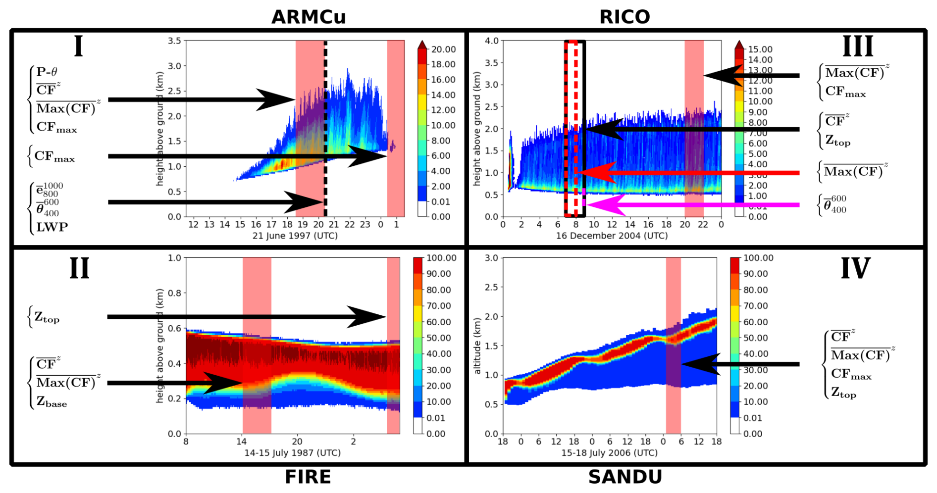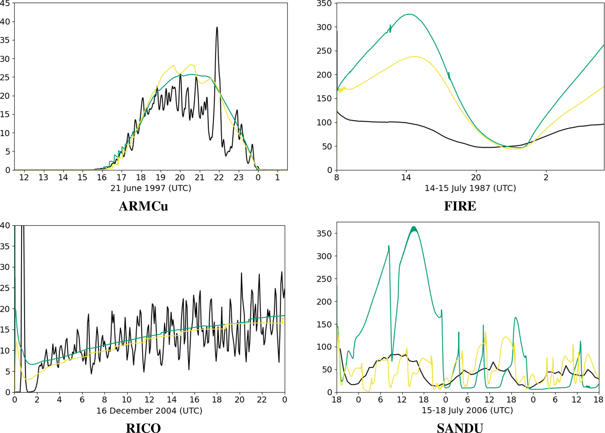 This study examines four well-documented cases of low-level clouds in the ABL. The ARMCu cumulus cloud is an idealized shallow convective cloud, formed during the Atmospheric Radiation Measurement (ARM) campaign on 21 June 1997 in the Great Plains region of the United States (Brown et al.2002). The RICO case is an idealized shallow precipitating cumulus cloud over the Atlantic Ocean, based on observations collected during the Rain in Cumulus over the Ocean field study (vanZanten et al.2011) near the islands of Antigua and Barbuda. The FIRE case is a marine stratocumulus topped boundary layer, defined by Duynkerke et al. (2004) based on observations from the First ISCCP Regional Experiment and the EUROpean Cloud Systems (EUROCS) project. The SANDU case is an idealized stratocumulus-to-cumulus cloud transition described in Sandu and Stevens (2011), which is a stratocumulus-topped deepening boundary layer, driven mainly by sea surface temperature (SST) in the north-eastern Pacific.
