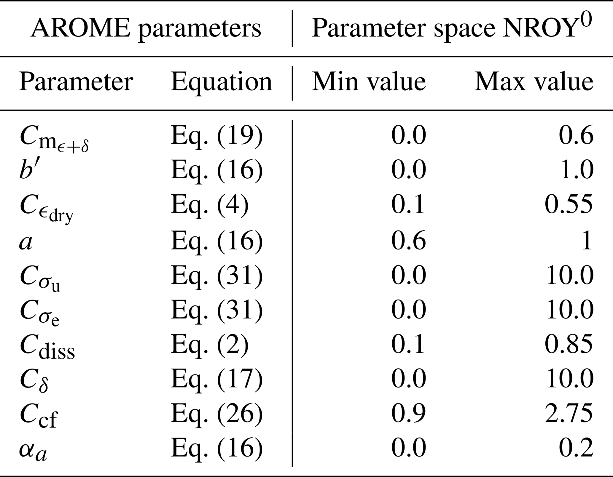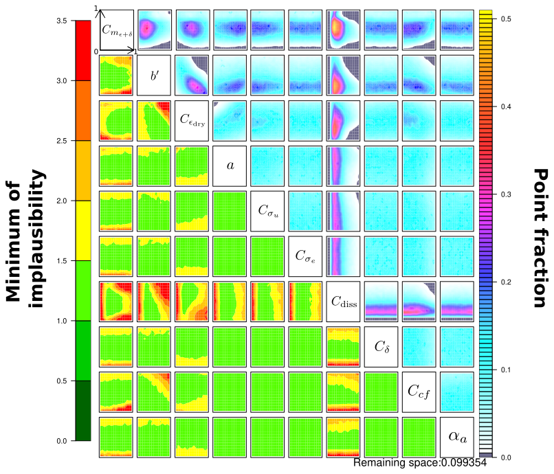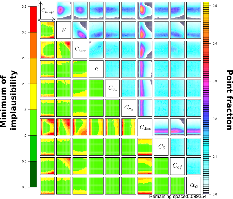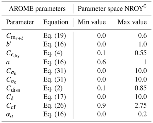The set of parameterizations includes a significant number of closure parameters. Most of these can be explained by a physical interpretation, providing insight into their values. However, it is uncertain whether model bias and the failure to represent the underlying physical phenomena ensure total agreement between the expected physical value and the effective value that best represents the subgrid fluxes. Additionally, a manual calibration of the free parameters is difficult due to the many degrees of freedom. Even for a few parameters, let's say 5, we would need 105 simulations with an SCM framework, if we sampled the range of possible values for each free parameter with 10 values. Here, we use surrogate models to sample and explore the associated N-parameter space appropriately, using the HighTune explorer tool (HTexplo), which has already proven particularly useful in the parameterization community. A detailed description of the tool can be found in Couvreux et al. (2021) and Hourdin et al. (2021). It works by exploring and resampling the parameter space NROY0 (The initial Not Ruled Out Yet space) associated with a selected number of free parameters, using history matching (Williamson et al.2013) with iteratively refocusing waves. Each wave discards, from the initial parameter space, the parameter combinations that produce simulations too far from the reference LES (using a set of metrics). A brief description of the HTexplo steps can be found in Appendix B.