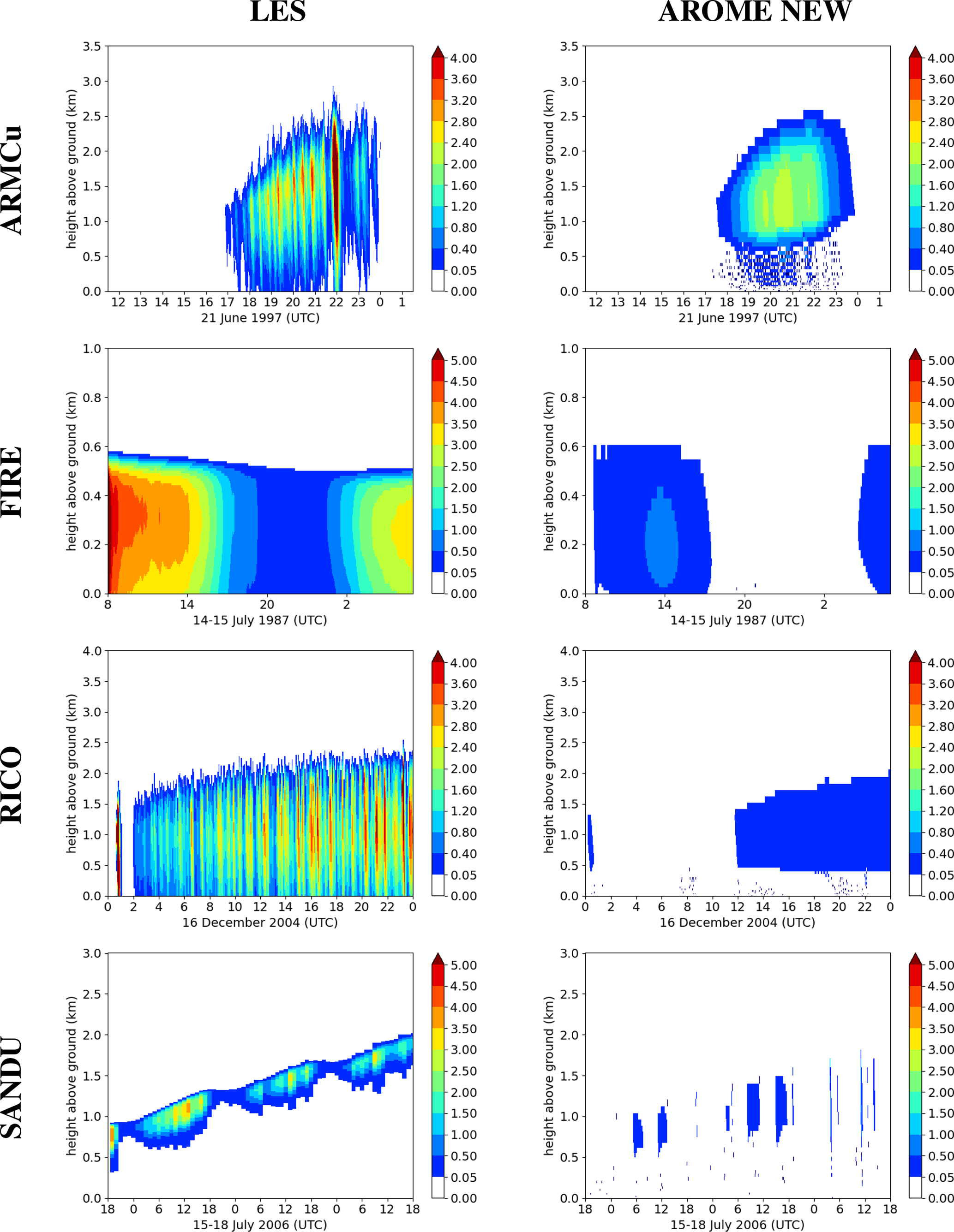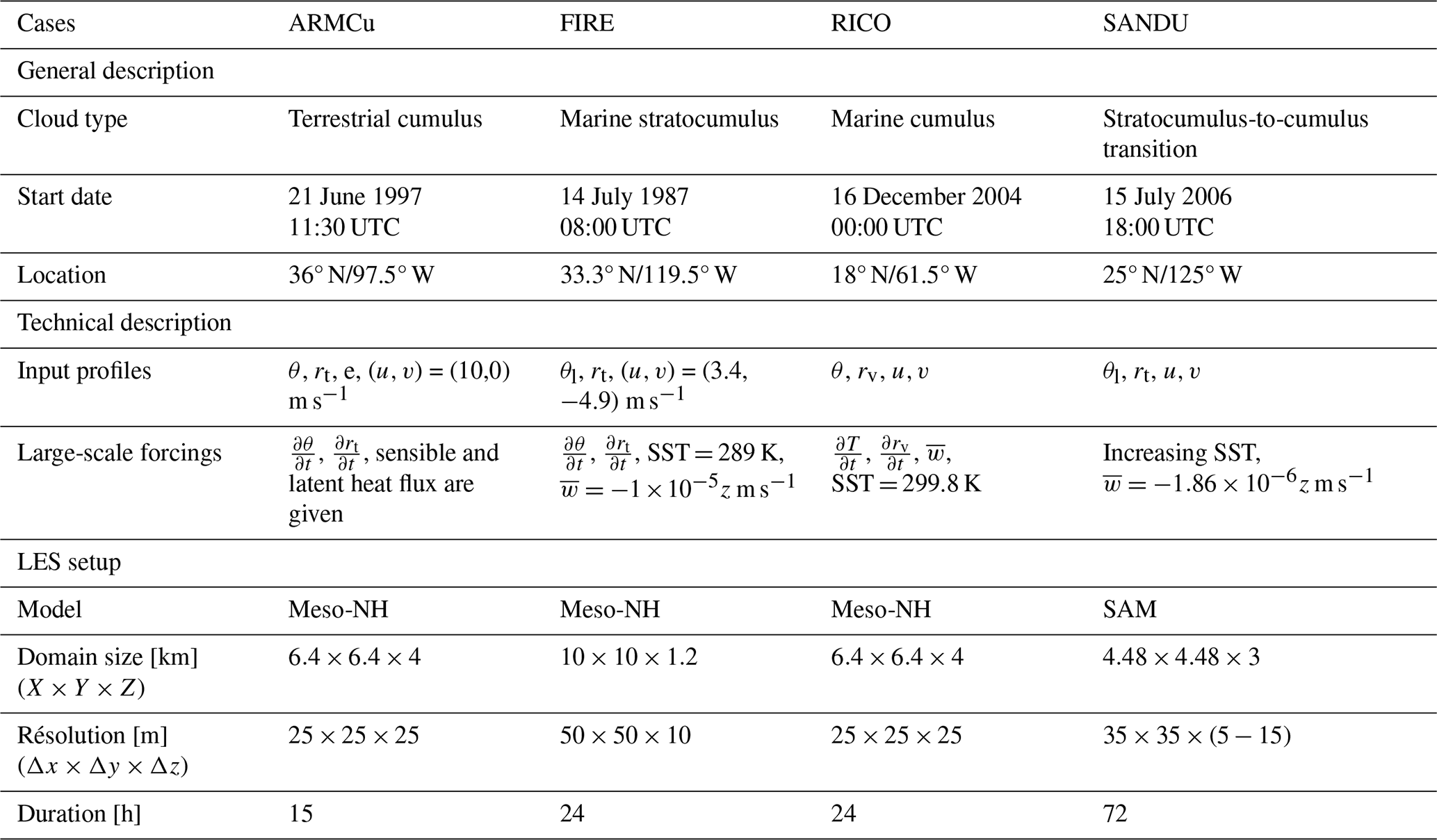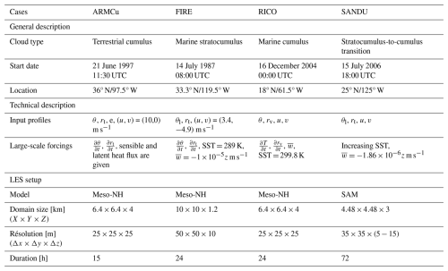 From these idealized cases, we have carried out a number of LES using the Meso-NH research model (Lac et al.2018). As the physics of AROME comes from Meso-NH, it should be noted that the underlying physics of Meso-NH LES is really close to that of AROME with only minor differences in the schemes: basically, the activated radiation and microphysical scheme are the same between AROME and the performed LES. In Meso-NH LES, the shallow convection scheme is disabled and the turbulence scheme is a modified version of the AROME scheme, including horizontal fluxes. Meso-NH offers the opportunity to run a wide range of offline and online diagnostics (e.g., coarse graining and energy budgets) and the conditional sampling method from Couvreux et al. (2009) is implemented. This method uses passive radioactive tracers to recover simulated objects in the LES grid. However, for technical reasons, we used a System for Atmospheric Modelling (SAM, Khairoutdinov and Randall2003) LES for the SANDU case. Its physics is close to the Meso-NH model. In parallel, all cases are run with an SCM version of AROME: Modèle Unifié, Simple Colonne (MUSC, Malardel2008), which serves as a basis for developing new parameterizations and implementing modifications with reasonable time and resources. The AROME SCM requires input profiles and large-scale forcings to be supplied in a standard format defined by the DEPHY community (see: https://github.com/GdR-DEPHY/DEPHY-SCM, last access: 8 October 2021). Table A1 summarizes the general description of the ABL cases, the input profiles and large-scale forcings (generated from their respective reference articles) provided to MUSC and the LES, and the LES configurations.