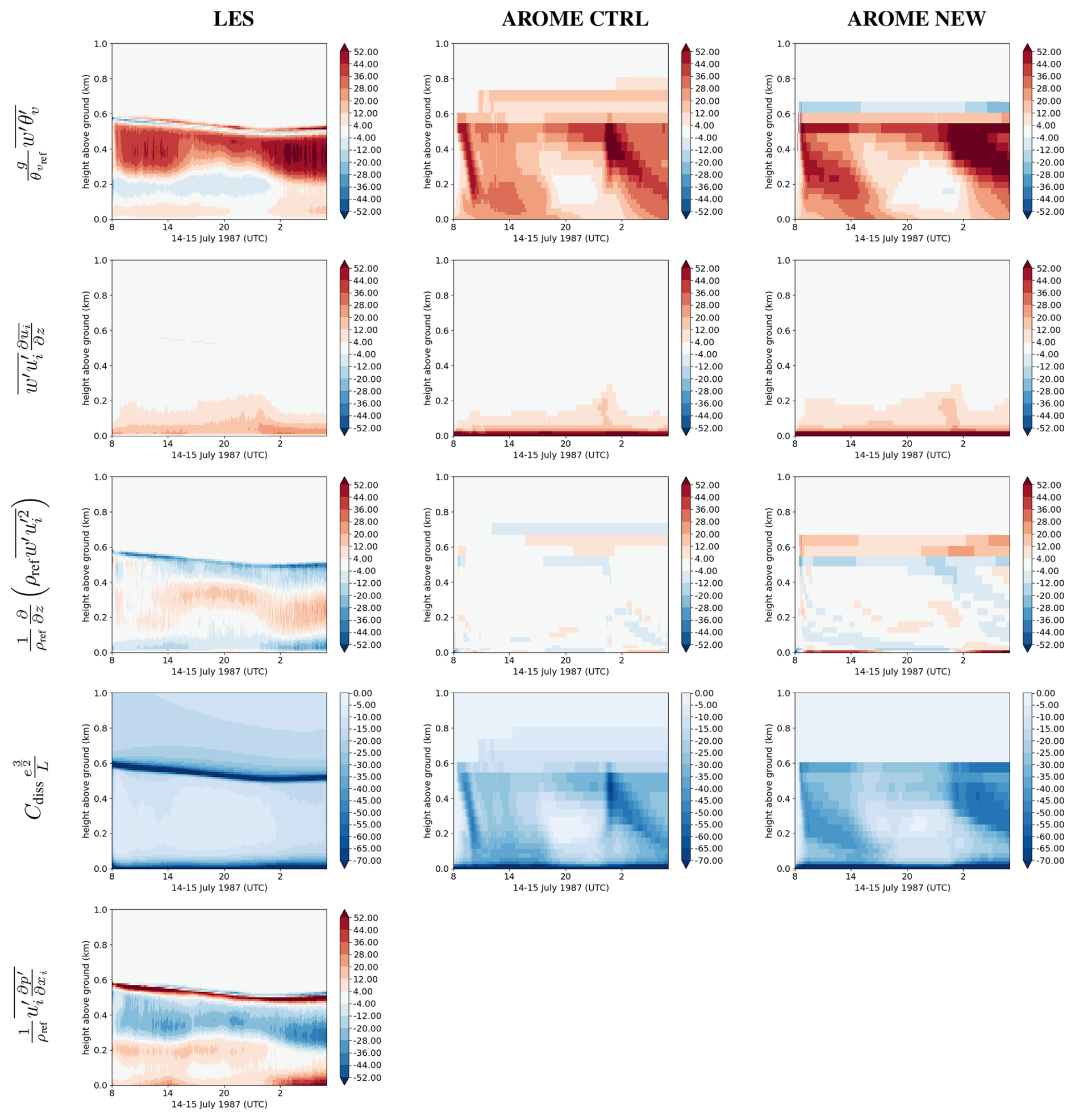 Both AROME and Meso-NH use an 1.5 prognostic Turbulent Kinetic Energy (TKE) equation closure scheme from Cuxart et al. (2000) (CBR). Using the Einstein summation notation (i,j{1,2,3}), the prognostic TKE (e=12ui2) equation reads as follows:
