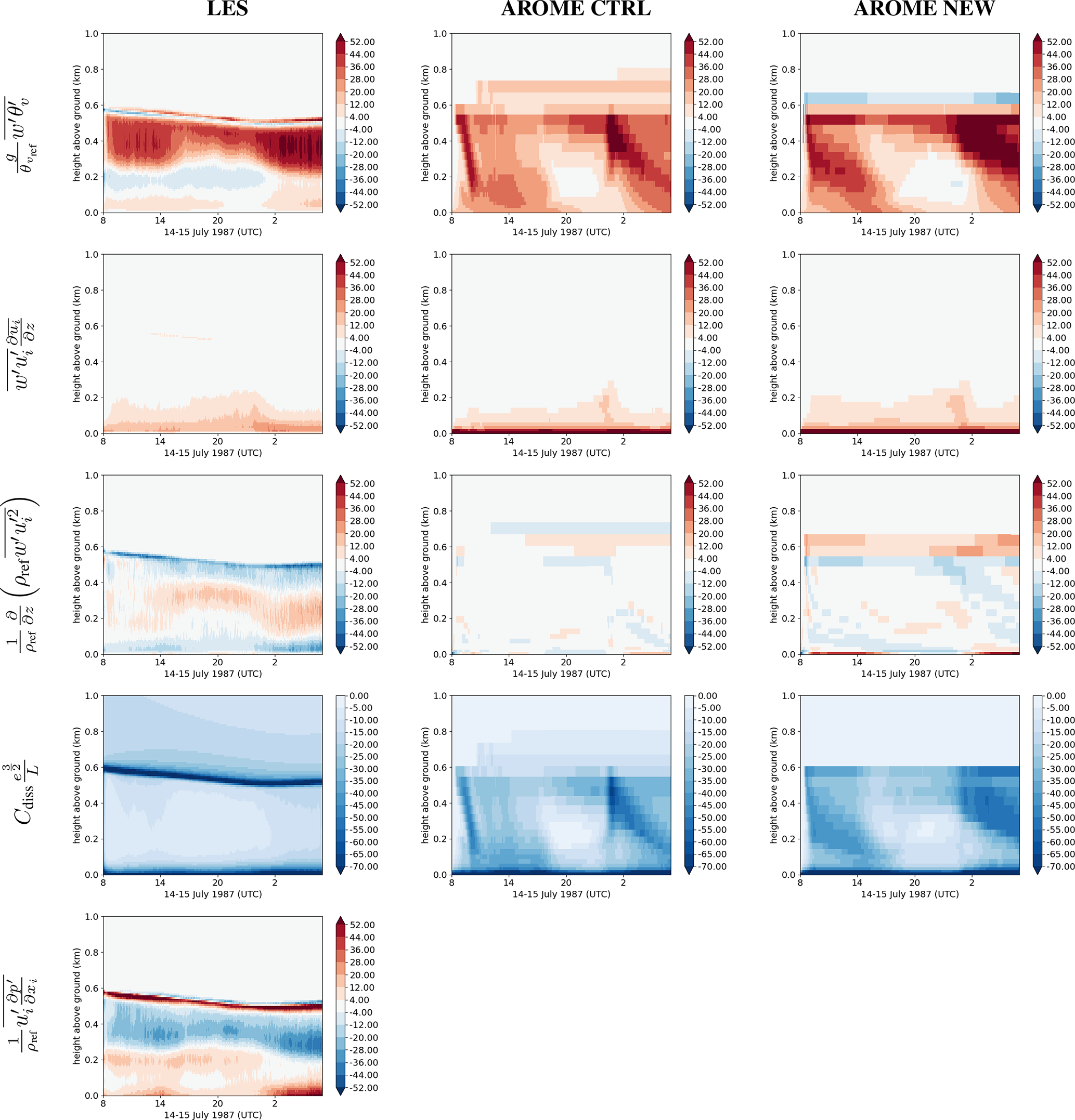 In the CBR scheme, this relation is closed by setting ujui22=-C2mLme12exj, ϵe=Cdisse32Lϵ, and wp=0 where C2m and Cdiss are constants for turbulent transport and dissipation, g is the acceleration due to gravity, Lm and Lϵ are the mixing and dissipation length scales respectively, and ρref and θvref are the reference density and reference virtual potential temperature, respectively. In AROME, Lm=Lϵ is the Bougeault-Lacarrere length (BL89, Bougeault and André1986; Bougeault and Lacarrere1989). Only the vertical components of Eq. (2) (except for the advection of TKE for which the three components are taken into account) are implemented in AROME, whereas all components are considered in Meso-NH. This corresponds to a 1D turbulence scheme. In this scheme, the diffusivity constants for the quantity ϕ are expressed as Kϕ=CϕLme½, where Cϕ is a constant for a specified diagnosed flux.