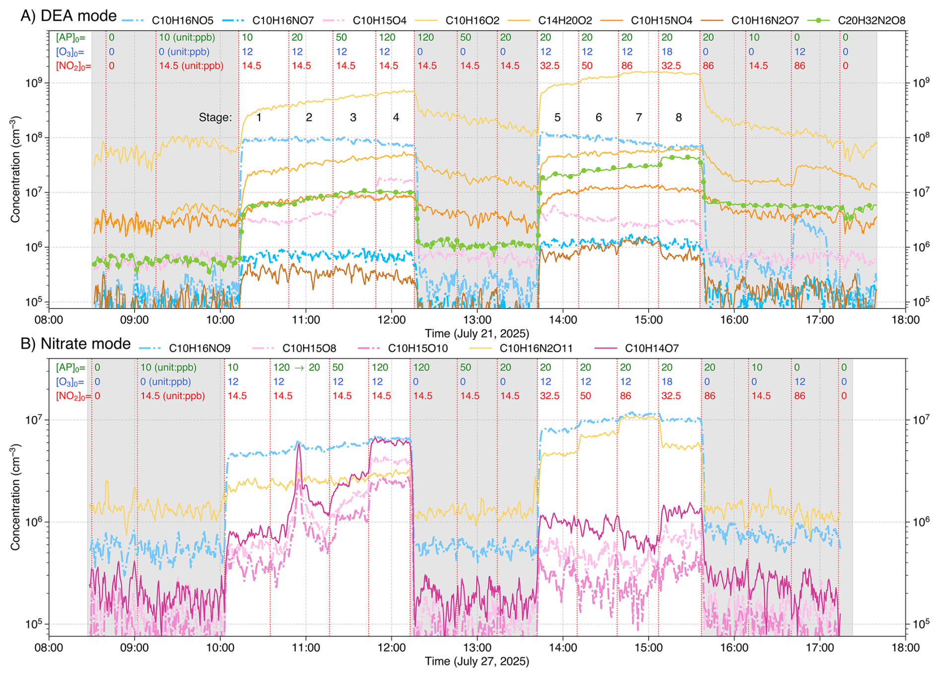 Figure 2Timeseries of major products from α-pinene (AP) + NO3 experiments, measured using both DEA (A) and nitrate (B) modes. Concentrations (in cm−3) of radicals, closed-shell monomers, and closed-shell dimers are shown as dash-dot lines, solid lines, and solid lines with markers, respectively. Products are color-coded by origin: expected NO3 oxidation products (radicals, closed-shell monomers, and dimers) are shown in blue, yellow-orange, and green colors, respectively, while expected O3/OH oxidation products are shown in pink. Grey shaded areas represent background stages. Initial precursor concentrations (in ppb) shown at the top of each subplot correspond to values present in the total flow of 100 L min−1, without any chemical conversion. The effective reaction time is 8.8 s. Note that the sharp spike in C10H15O8,10 and C10H14O7 at approximately 11:00 (B) resulted from an initial AP injection of 120 ppb, which was subsequently corrected to 20 ppb. While a mistake initially, this confirms that these three species originate from O3/OH oxidation.