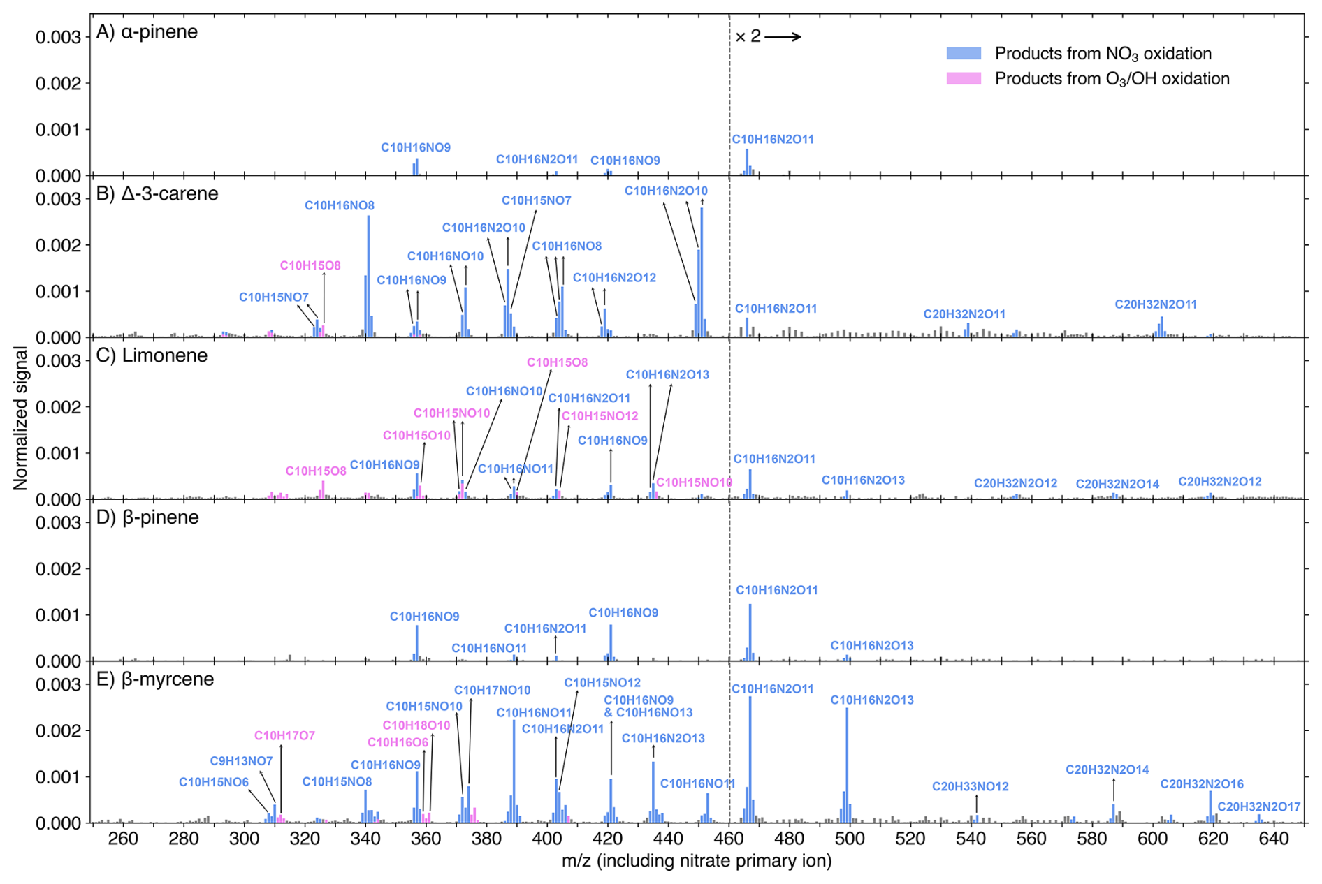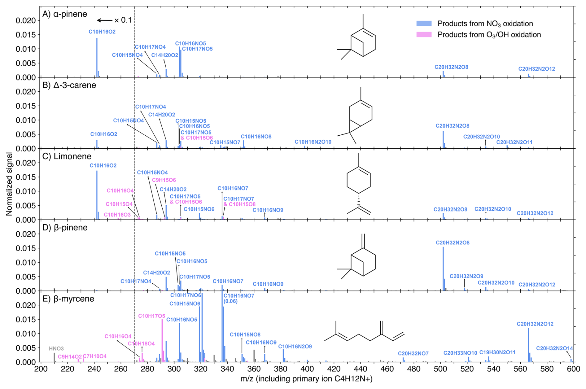 Figure 3DEA-CIMS spectra (10 min average) of MT + NO3 reactions at the experimental stage 6. Initial concentrations were [MT]0=20 ppb, [O3]0=12 ppb, and [NO2]0=50 ppb, with an effective reaction time of 8.8 s. The spectra display the normalized peak signals (see Eq. S4) and were corrected by subtracting background signals. Blue bars represent products (including both radicals and closed-shell species) from NO3 oxidation, pink bars show products from O3 or OH oxidation, and grey bars are for peaks not of interest. All compounds of interest were charged by clustering with the C4H12N+ reagent ion, which is omitted from the displayed molecular formulas for clarity. Peaks below 271 Th are divided by 10.
