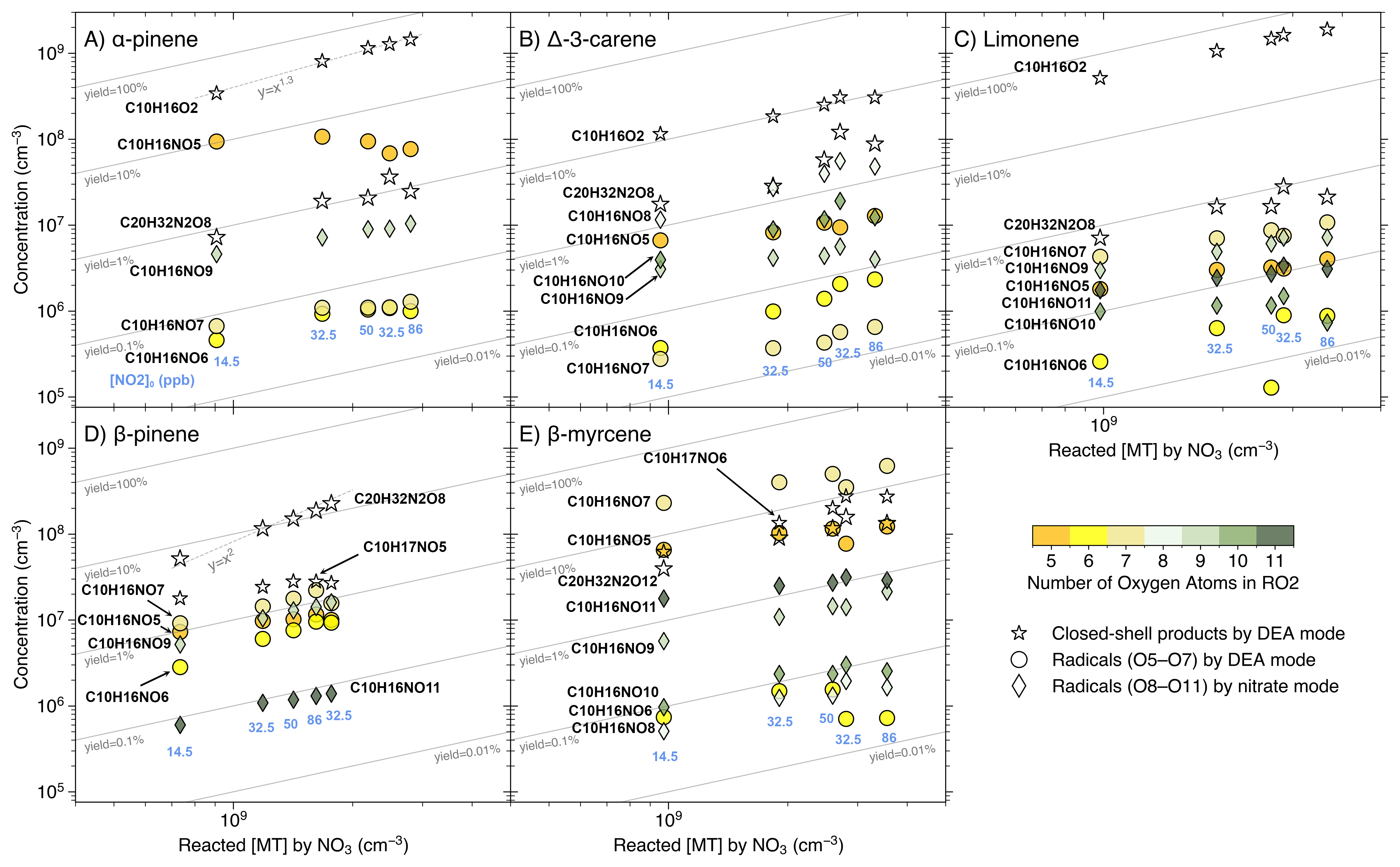 Consistent with previous studies (Draper et al., 2019; Hallquist et al., 1999; Kurtén et al., 2017; Spittler et al., 2006), NO3 oxidation of AP and limonene produced substantial C10H16O2 with yields exceeding 50 %, while carene produced much less C10H16O2 and instead underwent more efficient autoxidation. Several surprising features were also observed for the different MTs: i) for AP, with rising [NO3], the concentration of the primary RO2 radical C10H16NO5 did not increase as expected, but instead showed an increased yield of C10H16O2, ii) while our results agree with the previously proposed ring-opening process of BP following reaction with NO3, a dominant dimer C20H32N2O8 (with a yield of ∼10 % and a quadratic trend with reacted [BP]) was observed, suggesting very rapid accretion product formation in the gas phase, while an earlier study hypothesized that this dimer forms solely in the particle phase (Claflin and Ziemann, 2018), iii) the considerable amount of RO2 species C10H16NO5,7,9,11 from the acyclic myrcene suggests efficient autoxidation, but instead of H-shifts to form –OOH groups, we speculate that the RO2 undergo ring-closure processes with double bonds to form C–O–O–C groups, based both on expectations from its structure and on the relative detection efficiency of the products by DEA and nitrate modes.