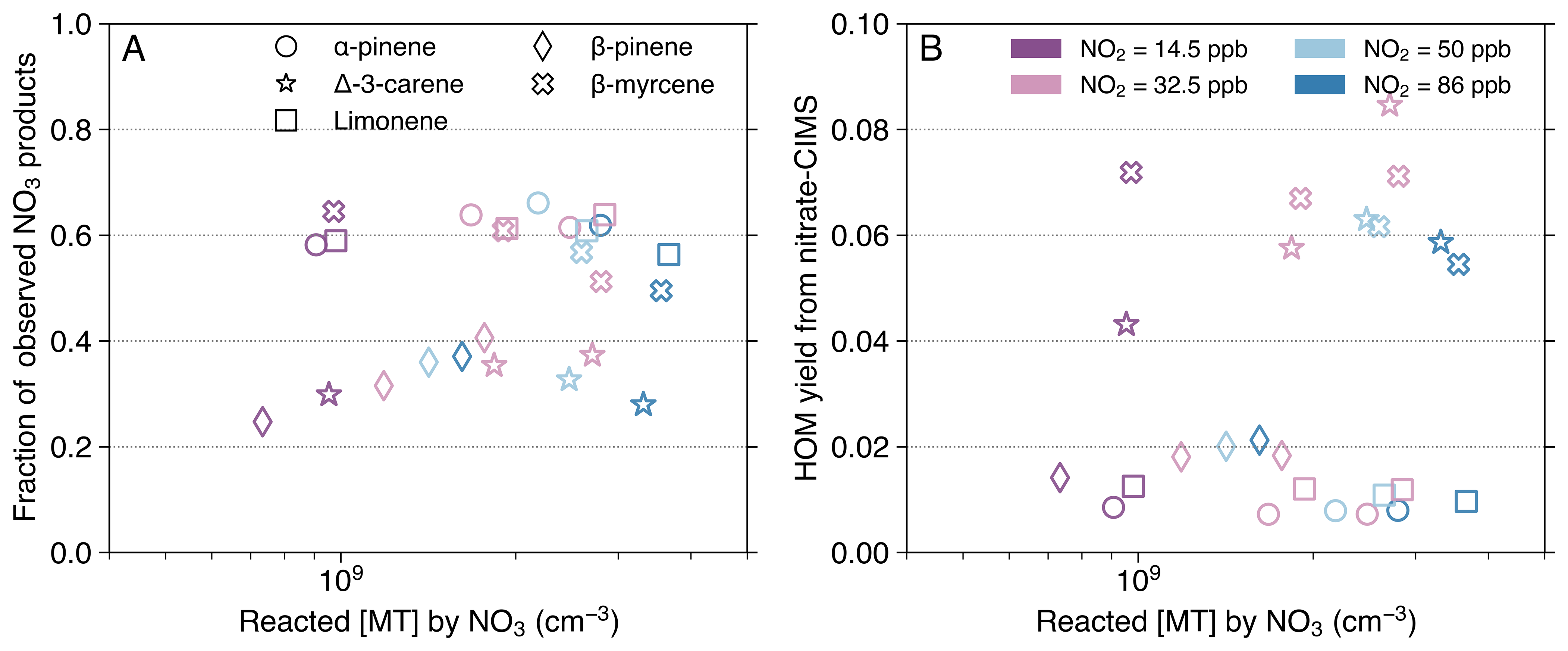 Figure 6Fraction of observed NO3-initiated products out of the total NO3-oxidized MT (A) and HOM yield (B), as a function of reacted [MT] by the NO3 radical. Data from experimental stages 2 and 5–8 are presented as 10 min averaged measurements taken at an effective reaction time of 8.8 s. The HOM yield (B) is solely based on nitrate-CIMS measurement. The calculation for the fraction of observed NO3-initiated products (A) combines HOM concentrations from the nitrate mode with less oxygenated products from the DEA mode. Exceptions were made for some HOM dimers: C20H32N2O9,10 (for all MTs) and C20H32N2O12 (for myrcene) were taken from the DEA mode due to their absence in the nitrate spectra (Fig. 4E). Dimer concentrations were multiplied by a factor of 2 to represent their monomer-equivalent contribution. Different MTs are distinguished by marker shape: circle (AP), star (carene), square (limonene), diamond (BP), and cross (myrcene). Marker colors denote the distinct [NO2]0 used in the experiments. Note that stages 5 and 8 have the same [NO2]0=32.5 ppb, but stage 8 has a higher O3 level and thus a higher reacted [MT] by NO3.