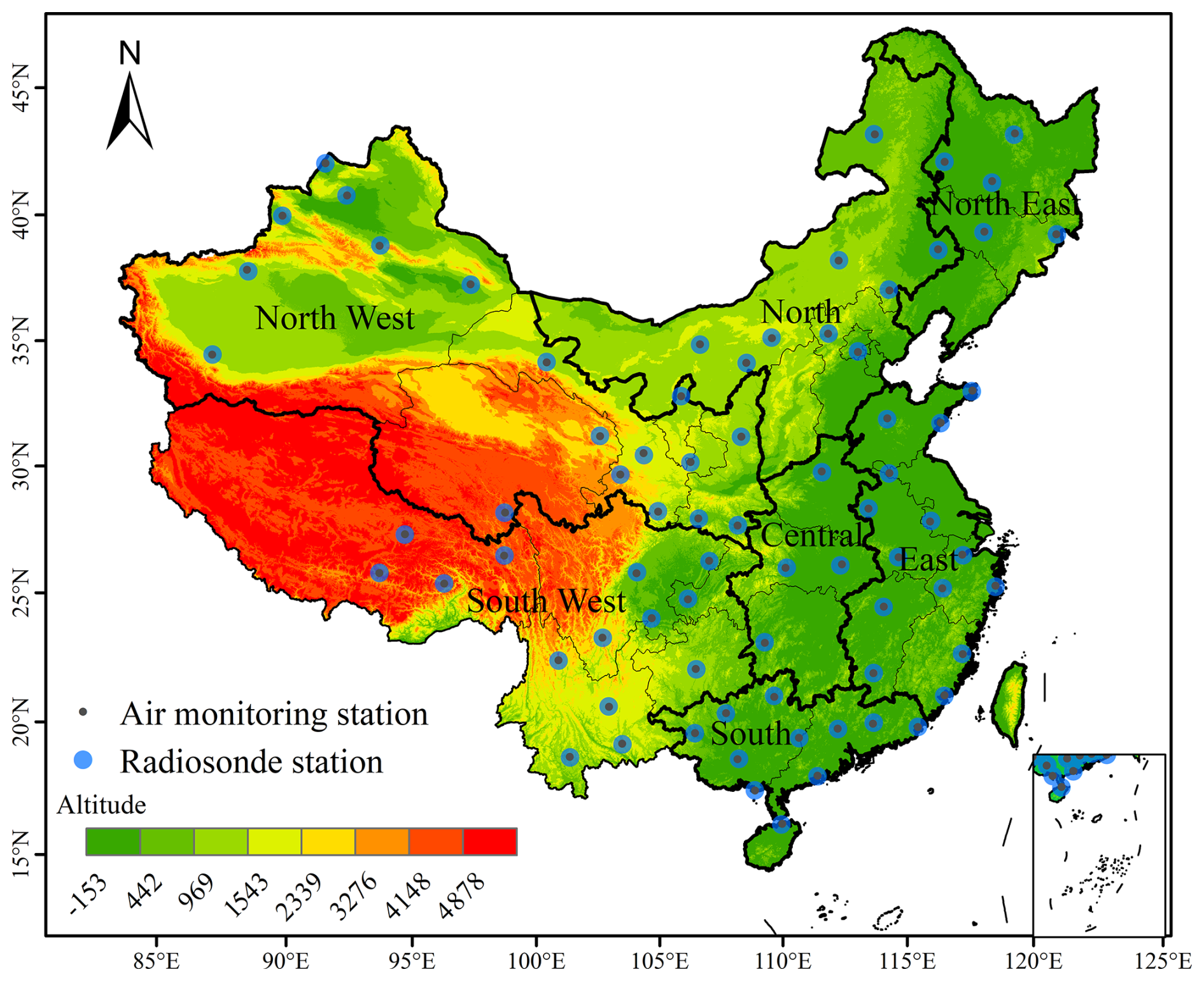 Figure 1Distribution of 75 radiosonde stations in China. The inset map in the lower right shows the South China Sea Islands.