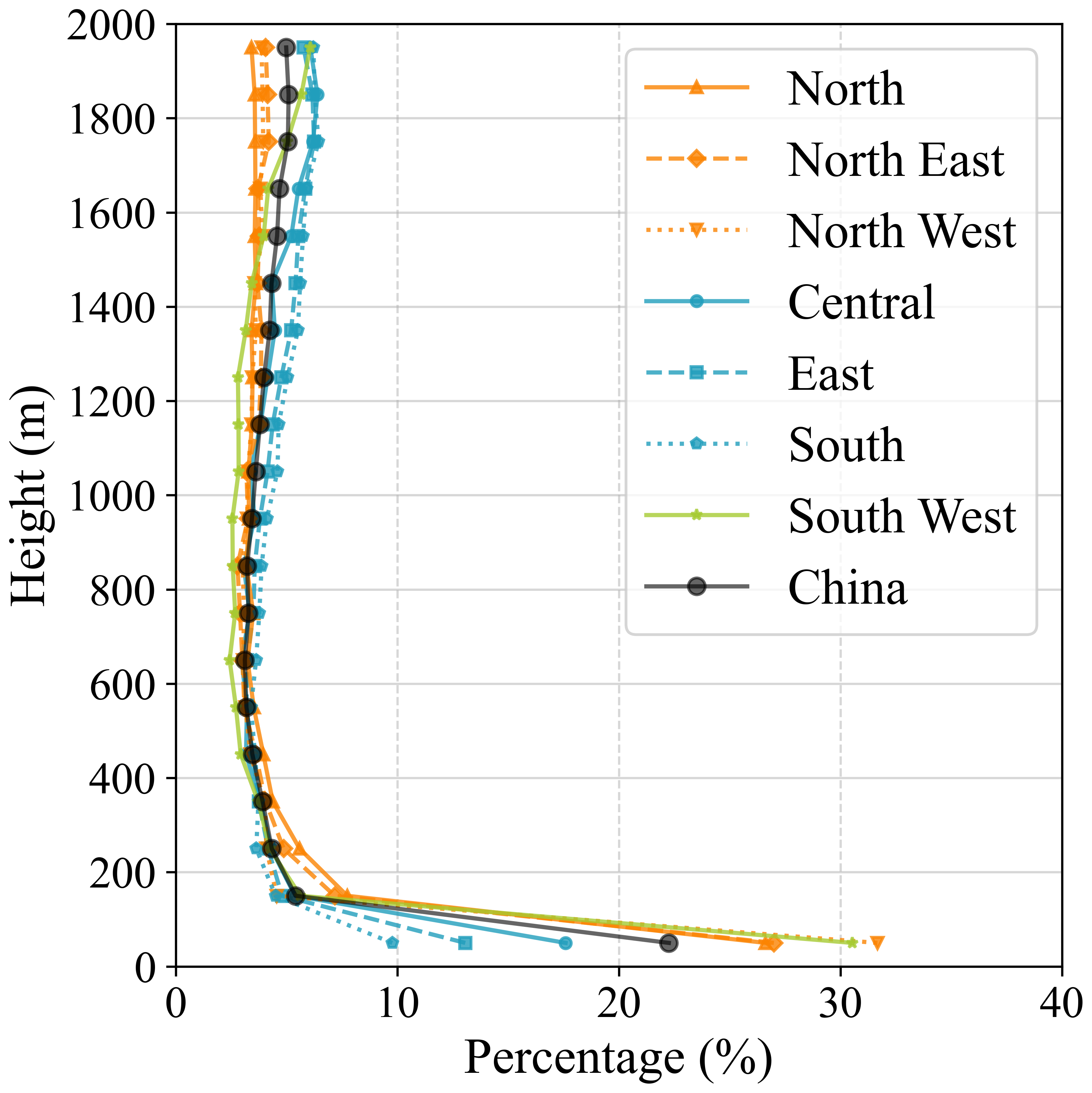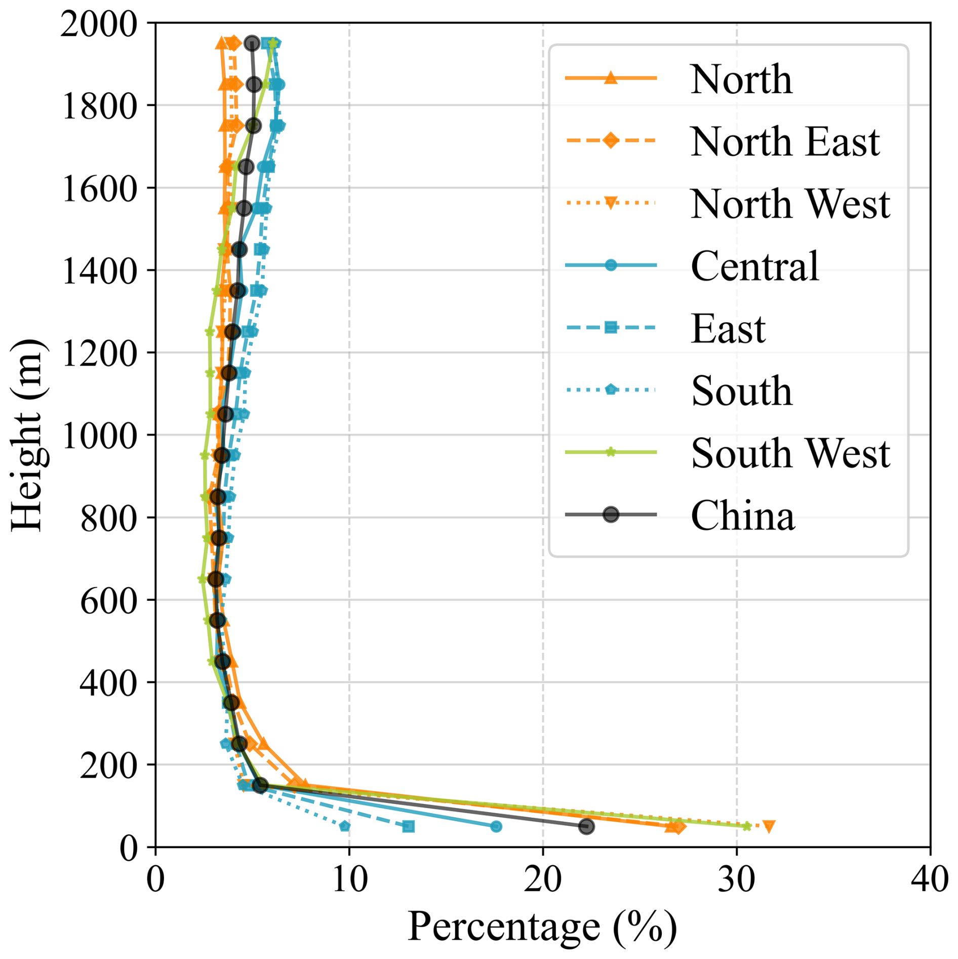The base height of TI sets the effective lid for vertical pollutant dispersion. To resolve its vertical structure within the boundary layer, we quantified the vertical distribution of inversion events. This is defined as the percentage of the total number of inversion events falling within each 100-m height bin from the surface to 2 km (Fig. 2). A distinct non-linear profile emerges: the TI proportion peaks sharply in the lowest 0–100 m bin, which comprises exclusively SBIs and accounts for 22.2 % of all inversion events. This peak is followed by a rapid decline to a minimum of 3.1 % at 600–700 m, and then a gradual recovery to 5.1 % at 1800–1900 m – i.e., a “rapid decline, then slow recovery” with height.
