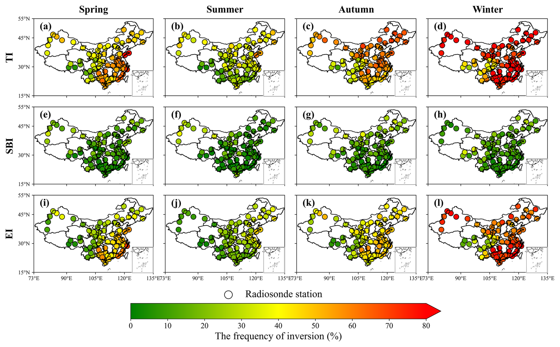 where Ht and Hb represent the top and bottom heights of the TI layer, respectively; Tt and Tb represent the temperatures at the top and bottom, respectively; N represents the total number of detections, NTI represents the number of detections where TI occurs, and NSBI and NEI represent the number of detections where SBI and EI occur, respectively.