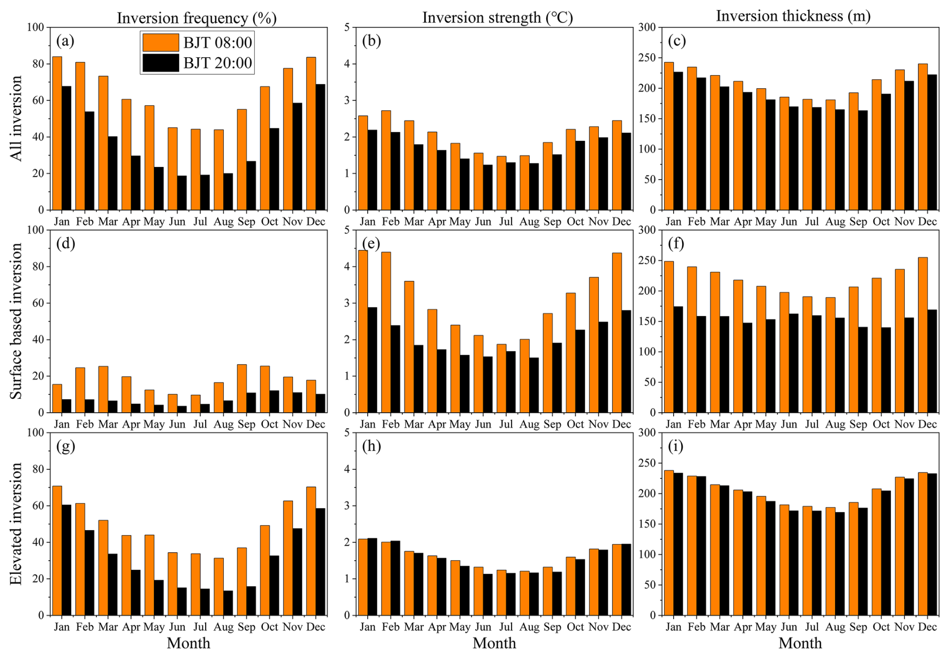 Figure 4a shows pronounced seasonality in TI occurrence. The highest monthly means occur at 08:00 BJT in January (84.0 %) and at 20:00 BJT in December (68.8 %), whereas minima appear in June (31.9 %) and August (32.0 %). SBI occurrence shows relatively high frequencies (> 24 %) in February, March, September, and October, whereas EI frequency exhibits a sharp, single peak in January (75.2 %). Seasonal contrasts are stark: inversions are most frequent in the cold season and relatively rare in the warm season. The spatial footprint of inversion-prone areas expands westward from summer to winter: in summer, only the Northeast exceeds 40 %, and the Southwest falls to 17.5 %; in winter, all regions except the Southwest surpass 70 %, reaching 80.5 % in the Northeast. SBIs and EIs share this seasonal phasing – winter maxima, summer minima – consistent with longer winter nights that enable sustained radiative cooling and stronger stability.