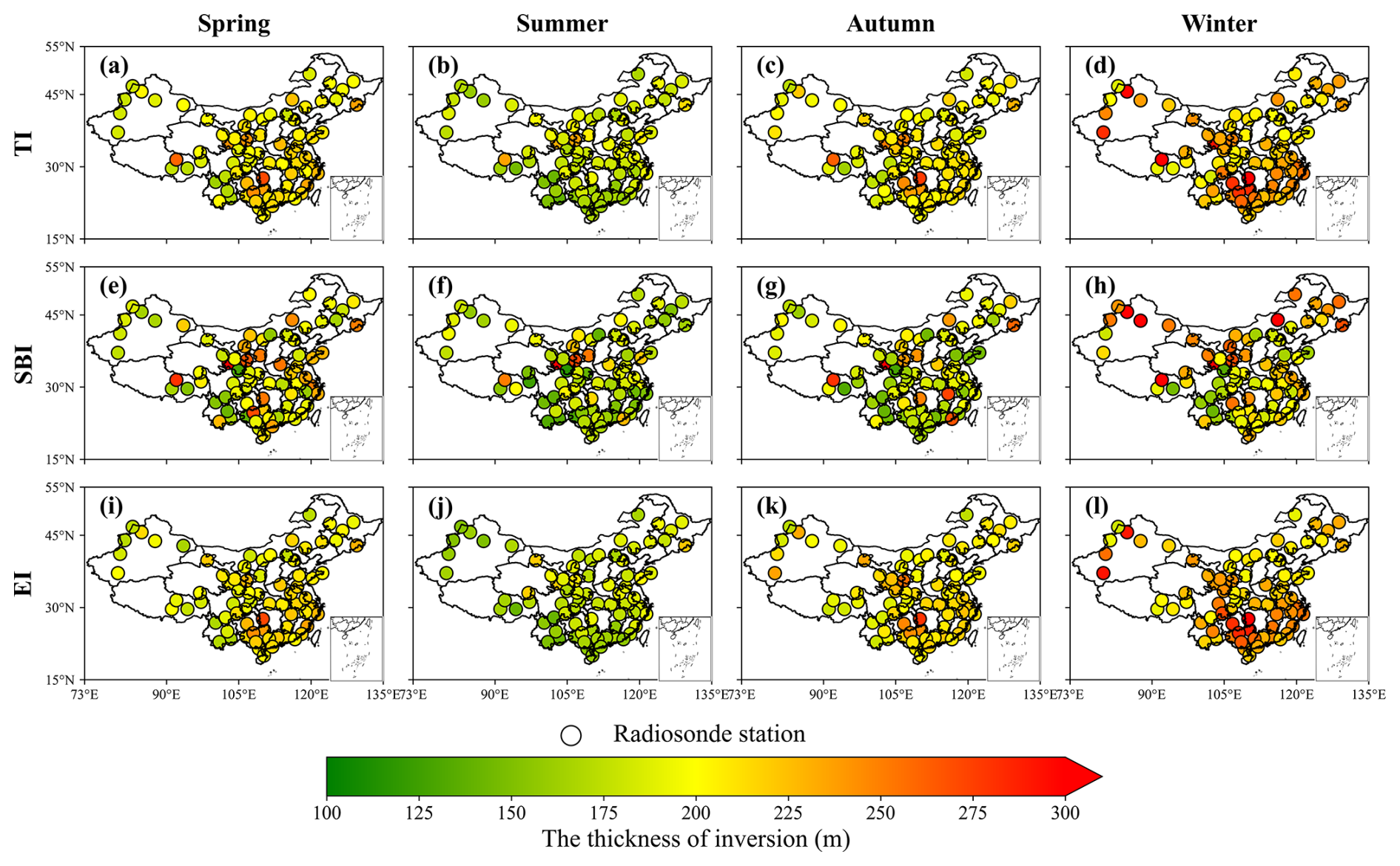 Seasonal and regional patterns of inversion thickness for all TIs, SBIs, and EIs are shown in Fig. 6 and summarized in Table 1. Across the 75 radiosonde stations, the annual mean thickness is 214 m. Layers sampled at 08:00 BJT are generally thicker than those at 20:00 BJT by about 40 m, consistent with the diurnal phasing of inversion intensity. Thickness varies markedly by season, maximizing in winter (231 m; Fig. 6d) and minimizing in summer (179 m; Fig. 6b). Monthly evolution follows a pronounced “V” shape (Fig. 4c), with a January peak of 243 m. By type, EIs are systematically thicker than SBIs, with annual means of 216 and 201 m, respectively. Both exhibit winter maxima and summer minima. At 08:00 BJT, EI and SBI each display a clear “V”-shaped monthly cycle, whereas at 20:00 BJT their behavior diverges: SBI thickness varies only modestly, while EI thickness remains comparatively stable across months (Fig. 4f and i). Spatially, TIs are notably thicker in the eastern and southern regions compared to the northern and western inland areas. Specifically, the average thickness in East, South, and Central China is 223 m, whereas it is 209 m in Northeast, North, and Northwest China. South China shows the largest annual mean thickness (231 m), exceeding the national mean, whereas the Southwest has the thinnest layers (202 m). This pattern aligns with the regional predominance of inversion types: thicker EIs prevail in the eastern/southern regions, while thinner SBIs are more common in the western/northern regions. The lower overall inversion frequency in the Southwest, combined with the intrinsic thickness contrast between EI and SBI, further contributes to these regional differences. Additionally, we discussed the scenario where the lapse rate () was used as a proxy for inversion strength, as elaborated in supplementary Fig. S16, S17 and Table S4 in the Supplement.