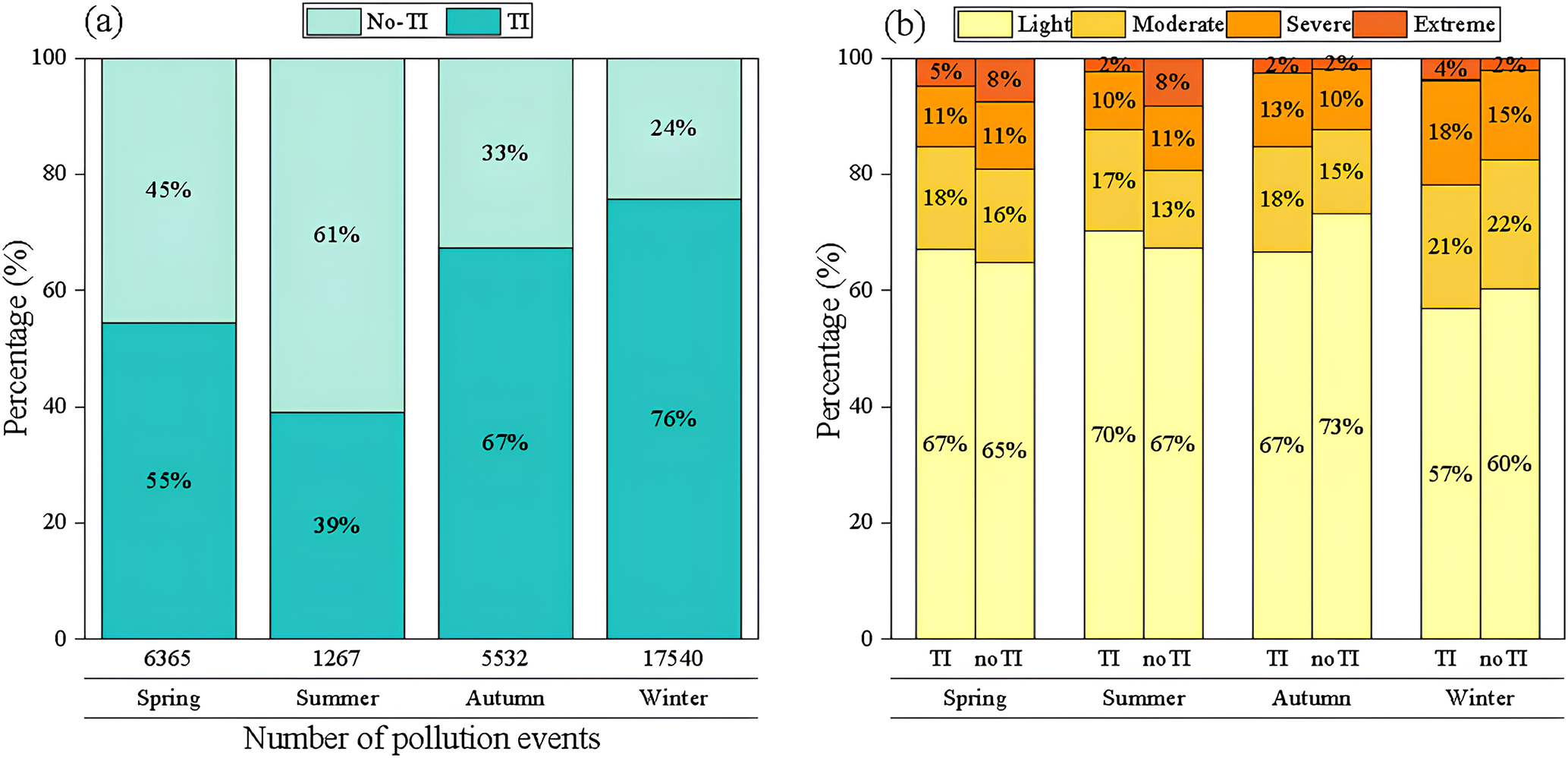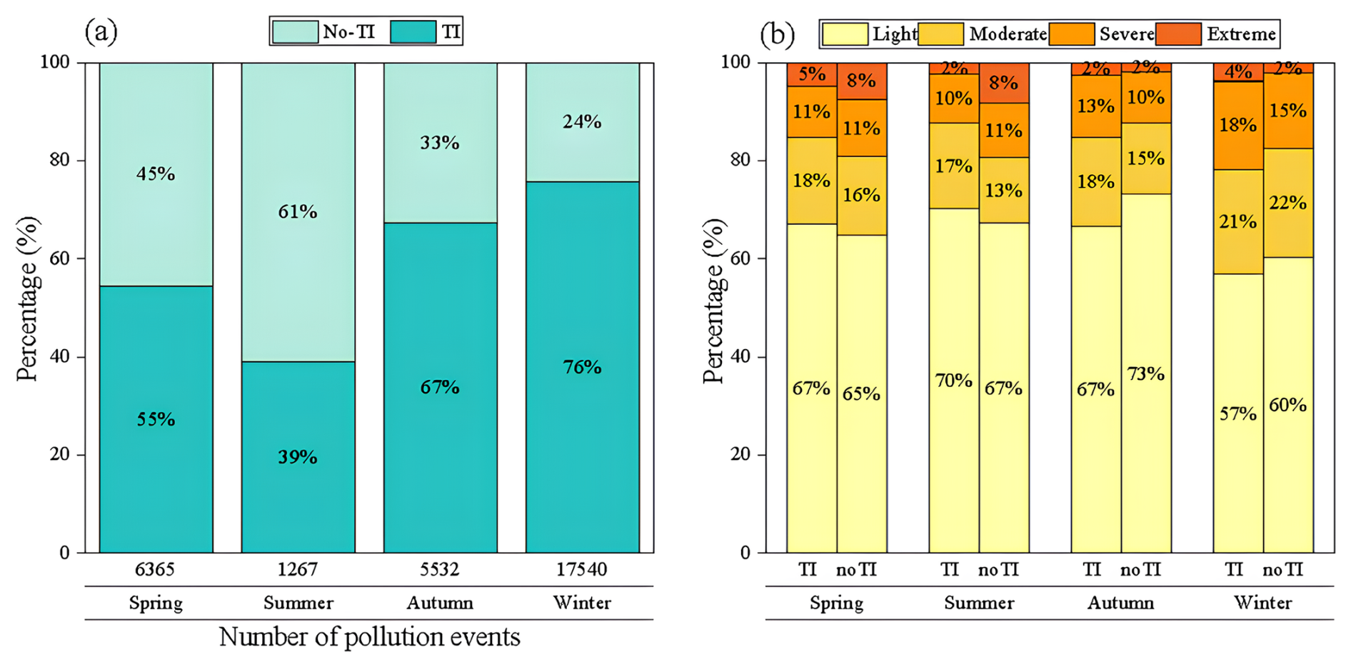 Figure 7a reveals strong seasonal heterogeneity. Winter registers the most pollution events (17 540), exceeding spring, autumn, and summer by factors of 2.7, 3.2, and 13.8, respectively. TIs substantially amplify this seasonal contrast: relative to no-inversion conditions, the probability of a pollution event rises by +52 % in winter, +34 % in autumn, +10 % in spring, and is negligible in summer. The muted summer response likely reflects a shift toward ozone-dominated chemistry, weakening the coupling between PM2.5 and inversion dynamics. Figure 7b shows that TIs not only increase occurrence but also severity – especially in winter – doubling extreme events (Level 4: 2 % → 4 %) and raising severe events (Level 3) by 3 percentage points (15 % → 18 %). These observations are consistent with the inversion-driven explosive growth conceptual model for PM2.5 (Zhong et al., 2017, 2018) and with the view that extreme haze is tightly linked to inversion meteorology (Yang and Shao, 2021). Autumn TIs exhibit a similar but weaker intensification (+3 % in moderate/severe categories), whereas spring and summer TIs chiefly affect lower-severity bins. Collectively, the results establish TIs as a critical wintertime meteorological driver of both the frequency and intensity of haze in China.