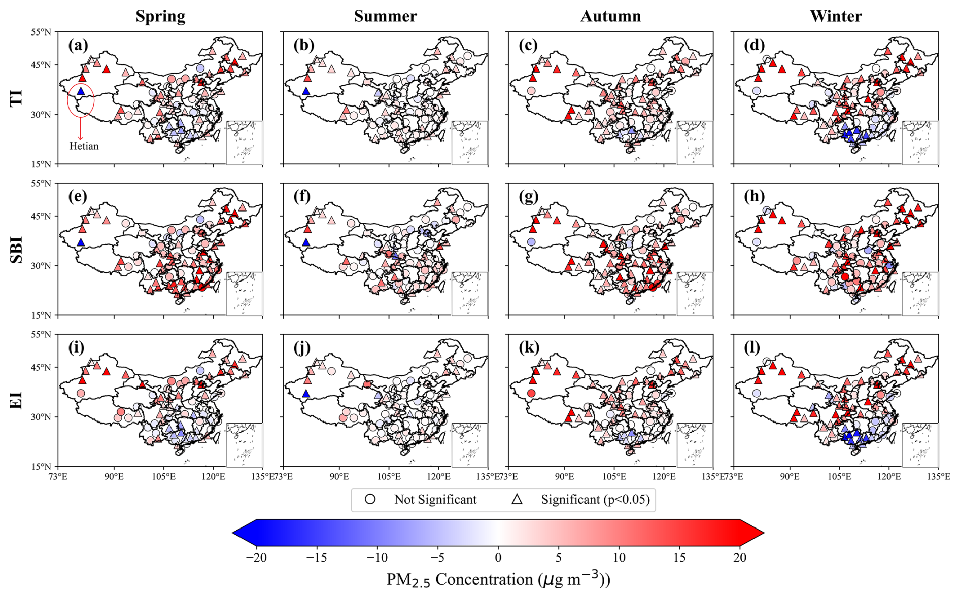 We quantify inversion impacts by contrasting the daily mean PM2.5 concentrations under inversion and non-inversion conditions, with statistical significance assessed using twosample ttests (Fig. 8). The time-resolved analyses for 08:00 and 20:00 BJT are shown in Figs. S12 and S13 in the Supplement. In eastern China, results broadly align with Shao et al. (2023): PM2.5 increases significantly under inversions in the Northeast (NEC) and North China (NC), whereas South China (SC) exhibits significant decreases. In western China, most stations also show PM2.5 enhancements during inversions, with a notable exception at Hetian (southern Xinjiang), where spring–summer concentrations decline significantly (Fig. 8a and b). This anomaly likely reflects the dust-dominated composition of PM2.5 (> 90 %) and frequent spring–summer dust storms near the Taklamakan Desert; strong winds that accompany dust events are unfavorable for inversion formation, rendering dust outbreaks and inversion episodes largely mutually exclusive (Aishajiang et al., 2020). Consequently, during inversion periods, the dominant dust component is largely absent, yielding lower PM2.5.