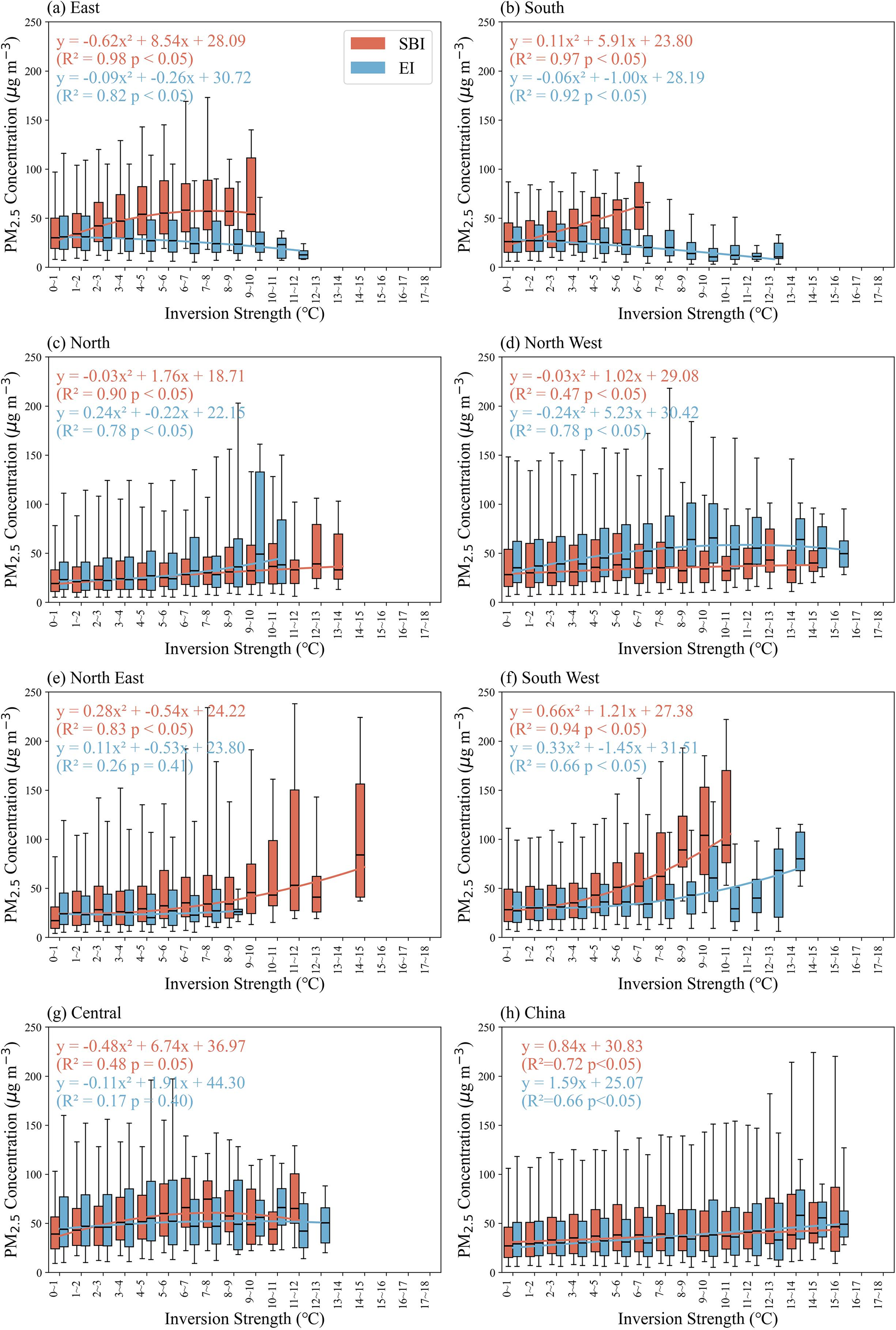 Figure 9Fitting relationship between inversion strength and PM2.5 concentration across seven regions of China from 2016 to 2021. The ends of the boxes, the ends of the bars, and the short line across each box represent the 25th and 75th percentiles, the 5th and 95th percentiles, and the median, respectively. Each strength interval contains a sample size ≥ 10.