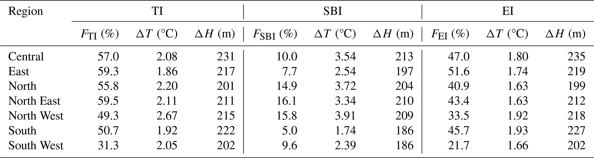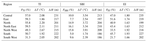 In meteorology, TI refers to the anomalous increase of temperature with altitude, most frequently observed in the lower troposphere. TIs arise through multiple mechanisms, including nocturnal radiative cooling, warm-air advection, topographic confinement, as well as under specific synoptic conditions such as stationary high-pressure systems (subsidence warming) and frontal zones (Vihma et al., 2011; Kassomenos et al., 2014; Largeron and Staquet, 2016; Xu et al., 2019). Surface-based inversions (SBIs) typically form at night when radiative cooling produces a shallow, stable layer of cold air near the surface, which usually dissipates after sunrise or under strong winds (> 20 km h−1) (Czarnecka et al., 2019). In contrast, elevated inversions (EIs) are often associated with synoptic-scale phenomena. Key driving mechanisms include synoptic-scale warm advection, subsidence within high-pressure systems, and frontal overrunning (Huang et al., 2021; Palarz et al., 2018).