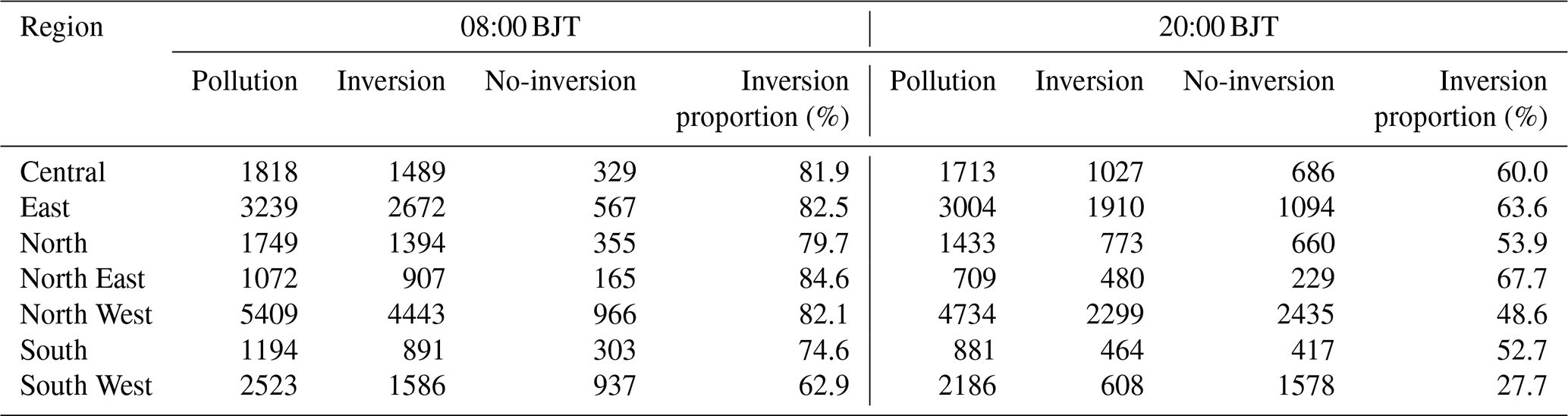 Nonetheless, most existing studies remain limited to individual cities or specific regions. For example, Wallace and Kanaroglou (2009) showed that nocturnal inversions in Hamilton, Canada increased PM2.5 concentrations by 54 %, with mobile observations further revealing the reinforcing role of local topography in inversion formation and pollutant buildup. In China, Xu et al. (2019) reported that 93 % of heavy pollution episodes in Beijing coincided with inversion conditions, while Feng et al. (2020) found that winter inversions in the Sichuan Basin elevated PM2.5 levels by 64.7 % compared with non-inversion days. Beyond China, Lagmiri and Dahech (2024) identified inversions as the dominant driver of particulate pollution in Cergy-Pontoise, France, with nearly 80 % of PM10 exceedances occurring under inversion conditions persisting 1–3 d in winter. Structural analyses have also revealed multi-layer inversion systems: Li et al. (2012) described a four-tiered inversion structure over central China, linking mid-tropospheric inversions to synoptic cold fronts and regional advection, while upper-level inversions exhibited strong latitudinal dependence.