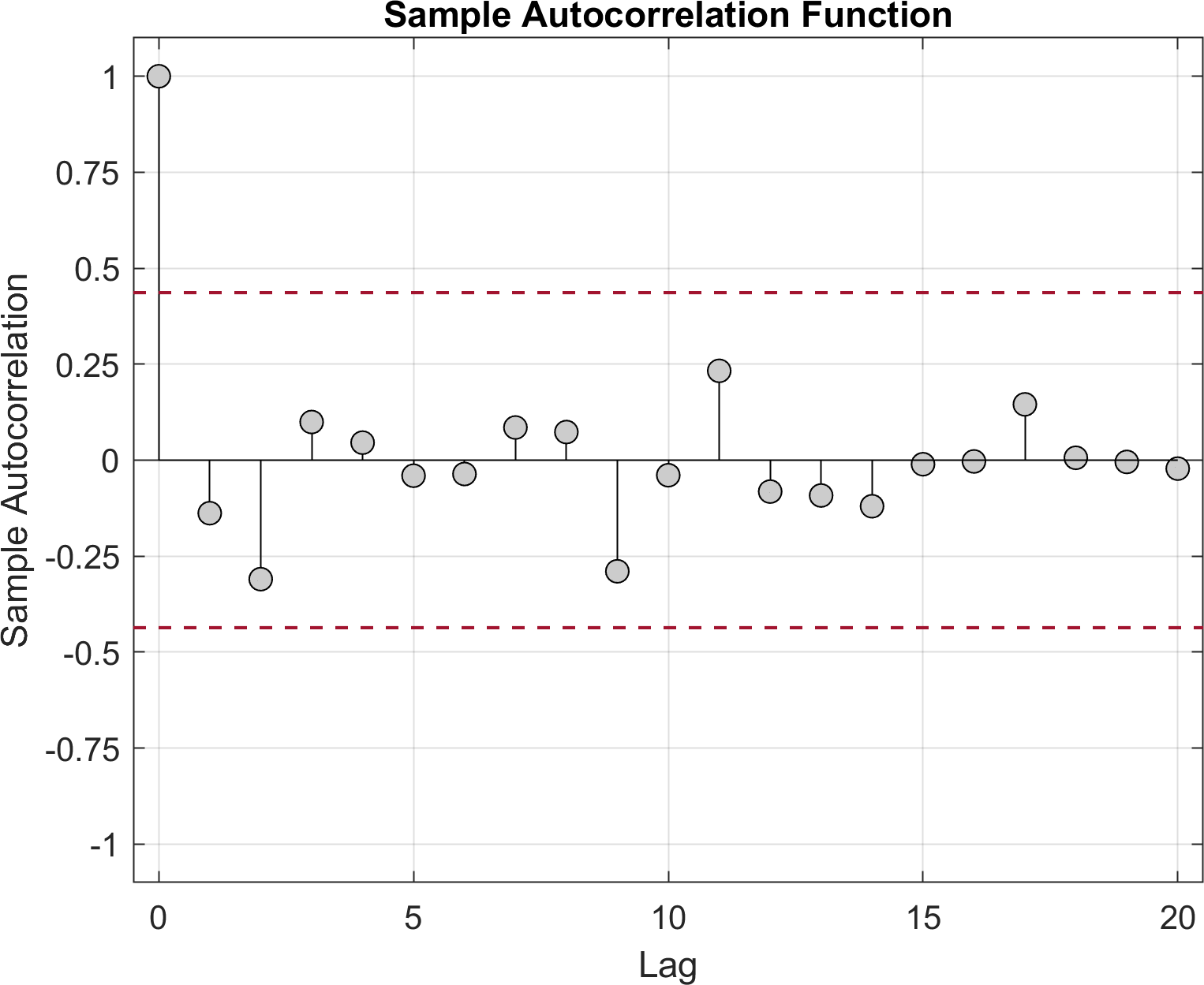 Figure 1Autocorrelation of the monthly averaged Cloud Radiative Effect (CRE), showing no significant autocorrelation in the data.