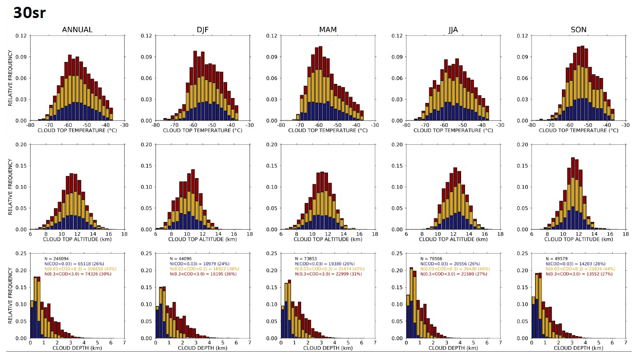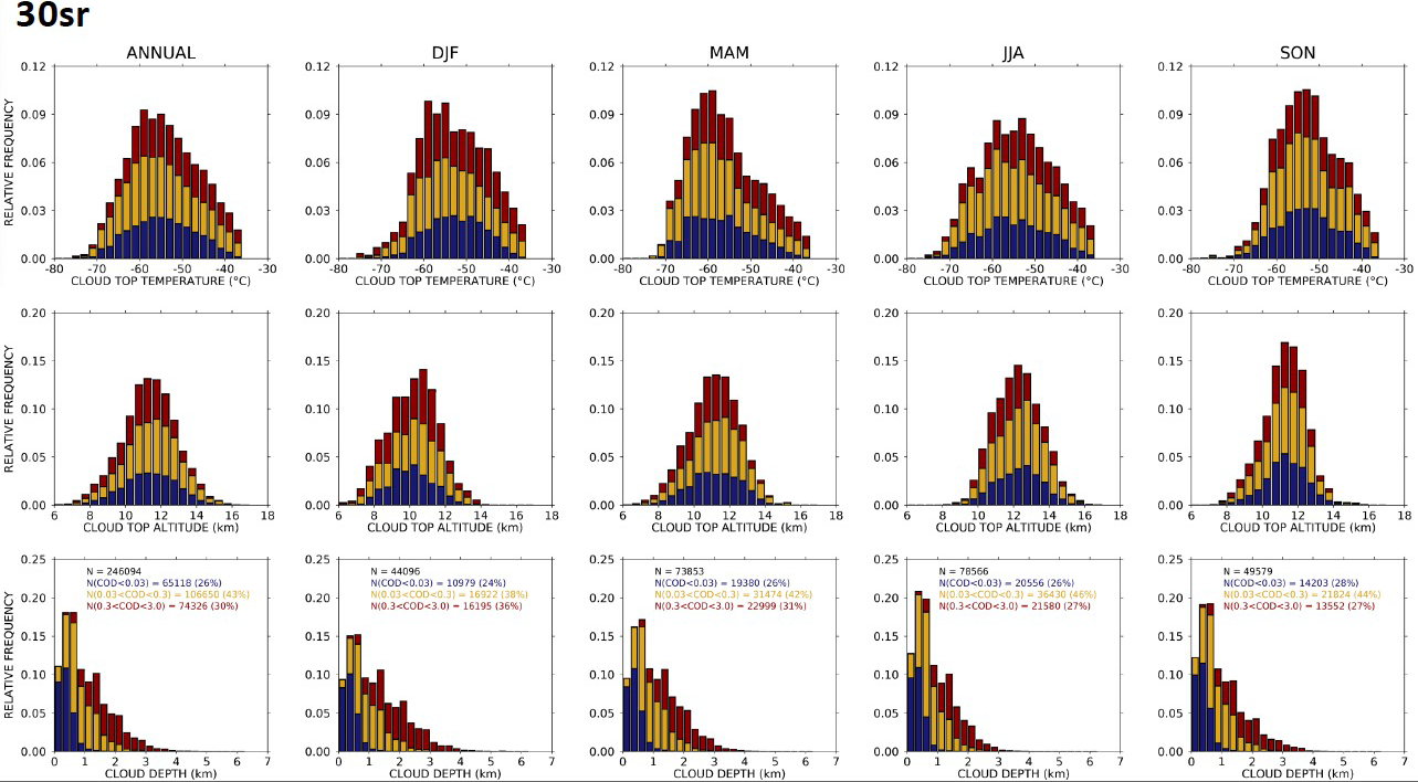 Figure 3 illustrates a comprehensive statistical analysis of three key cloud-related parameters, cloud top temperature, cloud top altitude, and cloud geometric depth averaged over different temporal windows for the 20-year database estimated from the 30 sr solution. The histograms display the relative frequency distributions of these parameters for the annual average and for each season: DJF (December, January, February), MAM (March, April, May), JJA (June, July, August), and SON (September, October, November). The first row of histograms shows the distribution of cloud top temperature, which ranges from approximately −80 to −30 °C. The distribution is roughly Gaussian in shape, with a peak around −55 °C. There are subtle variations across seasons, indicating that while cloud top temperatures are relatively stable on an annual basis, there are minor seasonal fluctuations. The second row represents the distribution of the cloud top altitude, spanning from around 6 to 18 km. These histograms also follow a Gaussian-like distribution, reaching a peak at approximately 13–14 km. Similarly to temperature, seasonal differences in altitude are minimal, suggesting a consistent vertical structure of clouds throughout the year. The third row focuses on the depth of the cloud, showing a different distribution compared with the other parameters. The distribution of cloud depth is skewed towards lower values, with a rapid decline in frequency as depth increases from 0 to 7 km. This indicates that shallow clouds dominate the dataset. Although the proportion of shallow versus deep clouds shows slight seasonal variation, the overall pattern remains consistent. In summary, the data suggest that cloud characteristics such as top temperature and altitude are relatively stable across different temporal windows, with only minor seasonal variations, whereas cloud depth exhibits a skewed distribution that consistently favors shallower clouds throughout the 20-year period.