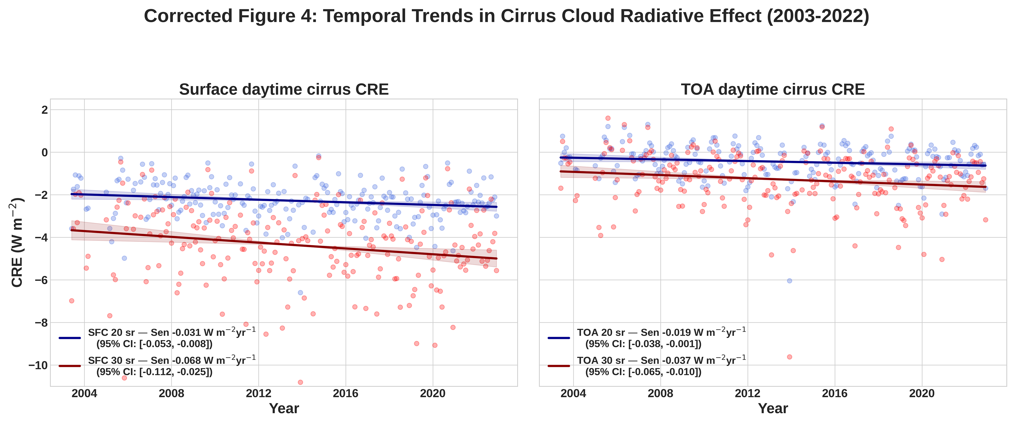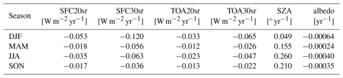 Table 1 summarizes the SZA-adjusted trends and split-period Theil–Sen slopes for the TOA and surface daytime cirrus CRE series.