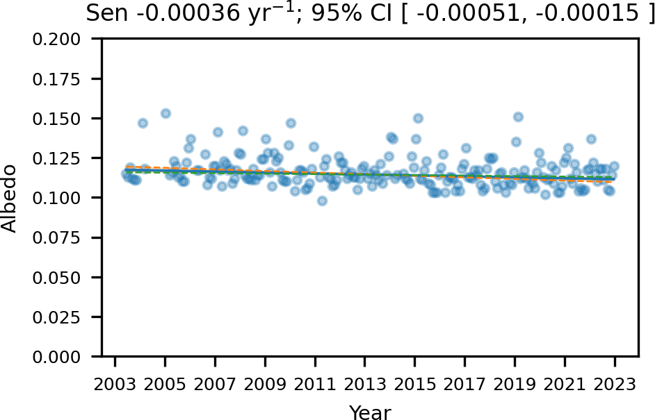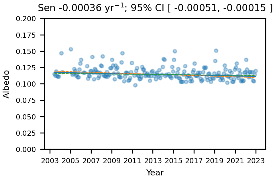 Summarizing, the surface albedo declines by yr−1 (Sen; 95 % CI ) and yr−1 (OLS; 95 % CI ).