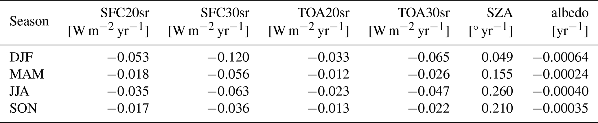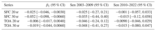 Table 1SZA–adjusted trends (β1 with Newey–West HAC(12) 95 % CI) and split-period Theil–Sen slopes (95 % CI). Units: W m−2 yr−1.