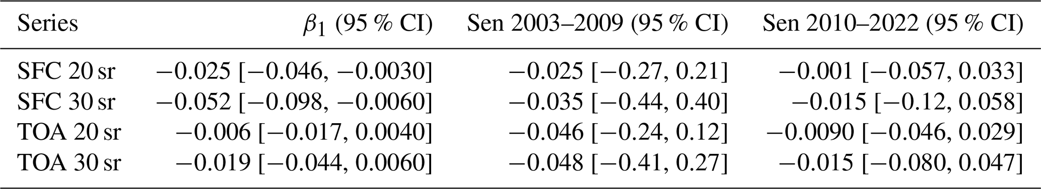 The surface CRE trends remain significantly negative, while the TOA trends weaken and are not statistically significant. For SFC 20 sr, the SZA-adjusted trend is W m−2 yr−1 (95 % CI ), and for SFC 30 sr W m−2 yr−1 (95 % CI ); both exclude zero. In contrast, TOA 20 sr and TOA 30 sr are (95 % CI ) and (95 % CI ) W m−2 yr−1, respectively, which include zero. Theil-Sen split period slopes are consistently negative in sign but imprecise within each subperiod. SFC 20 sr: −0.025 (2003–2009) vs. −0.0010 (2010–2022); SFC 30 sr: −0.035 vs. −0.015 ; TOA 20 sr: −0.046 vs. −0.0090 ; TOA 30 sr: −0.048 vs. −0.015 W m−2 yr−1. Taken together, these diagnostics indicate that negative SFC trends are robust to SZA variability, while SZA-adjusted TOA trends are negative in sign (−0.019 to −0.0060 W m−2 yr−1), but their confidence intervals 95 % include zero; therefore, we treat them as suggestive but not statistically robust at the level 95 %.