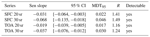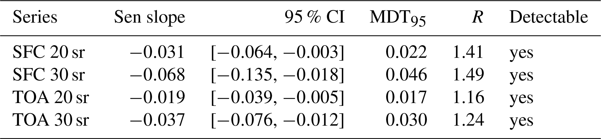 Table 2Trend detectability (Sen slope with 95 % CI), minimum detectable trend (MDT95), and ratio MDT95. Units for slopes and MDT95: W m−2 yr−1.
