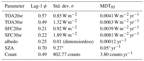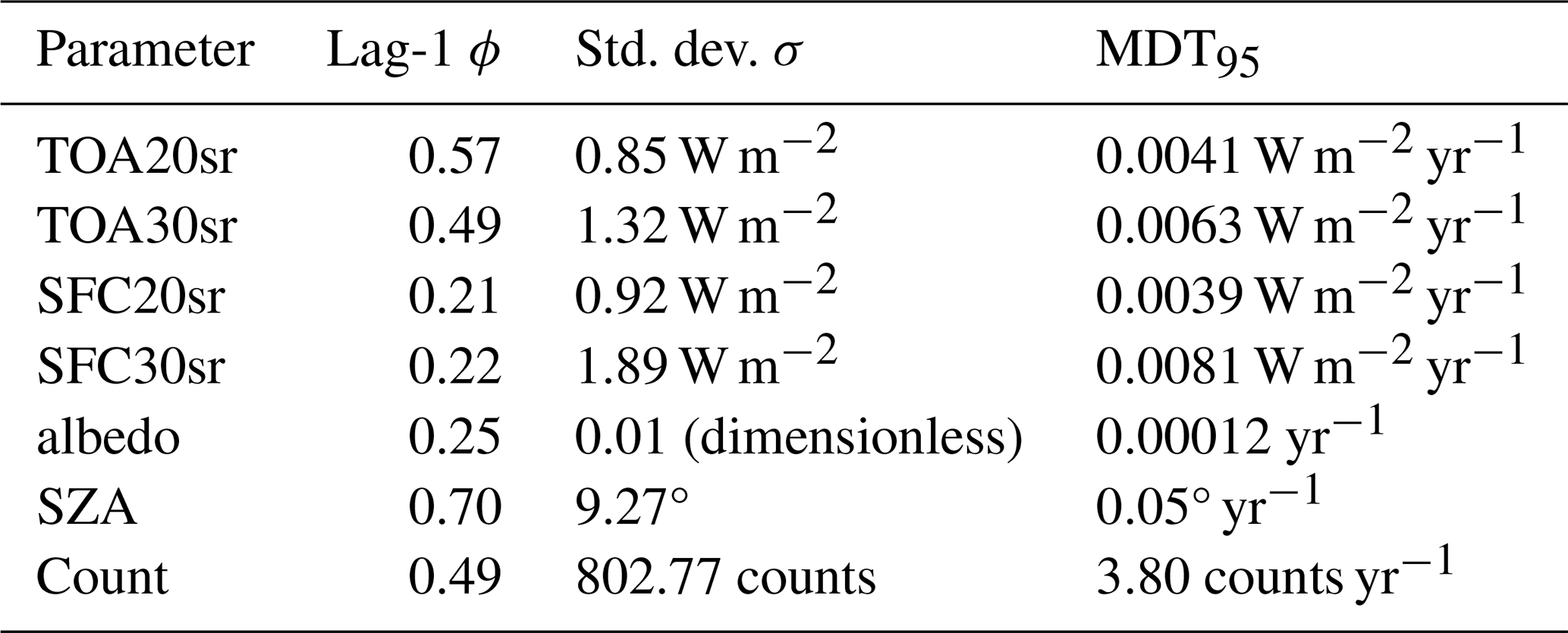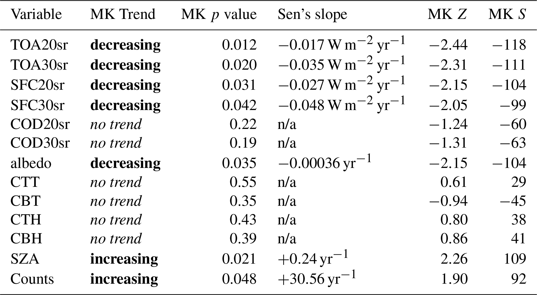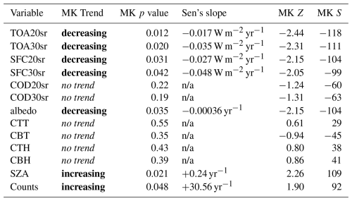 We evaluated the minimum detectable trend for statistically significant MK trends. Comparing the observed trend magnitudes (Sen's slope from Table 3) with the calculated Minimum Detectable Trends (MDT95, Table 2) confirms the robustness of our findings. For example, the Sen slope for TOA30sr was −0.035 W m−2 yr−1, which is substantially higher than its MDT95 of 0.0063 W m−2 yr−1. Likewise, the observed albedo trend of −0.00036 yr−1 is three times larger than its detection limit of 0.00012 yr−1. This comparison demonstrates that the key trends identified in this study are statistically robust signals and not artifacts of intrinsic noise or length.