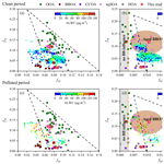 Here, the triangle plots of f44 versus f60, coloured by ALWC under different PM2.5 pollution levels, were analyzed (Fig. 6b, d), while the link between aqSOA and BBOA was further stressed by a schematic representation of aged BBOA. Except for a few outliers, f60 values were consistently higher than 0.003, and most data points fell within the triangular region, suggesting a widespread influence of biomass burning on OA. During PP, f60 ranged from 0.005 to 0.019 (0.010 ± 0.004), similar to the range observed in CP (from 0.004 to 0.019, 0.010 ± 0.003). However, the correlation between f44 and f60 was higher during PP (r2=0.72) than during CP (r2=0.31) (p<0.001). Moreover, data points within the schematic space of aged BBOA showed relatively higher ALWC compared with the overall dataset during PP, a pattern that was not evident during CP.