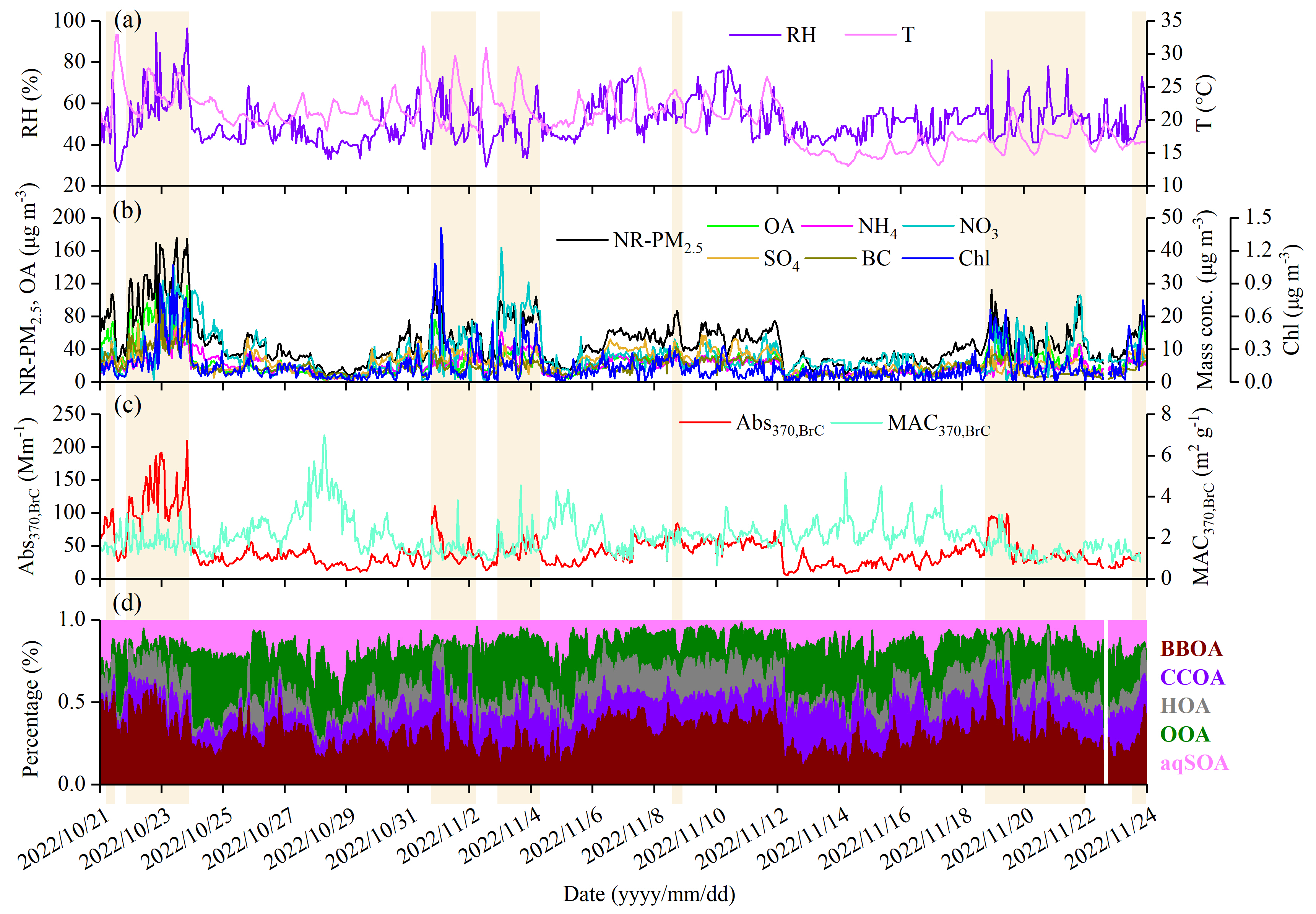 During the campaign, gaseous species (including O3, NO2, and CO) were continuously measured by gas analyzers (49i, 42i, and 48i, Thermo Scientific) that were maintained and calibrated weekly. Hourly meteorological parameter data, including temperature (T), RH, and PM2.5 mass concentrations, were obtained from the National Environmental Monitoring Station, located near our sampling site (http://www.cnemc.cn/, last access: 30 November 2022).