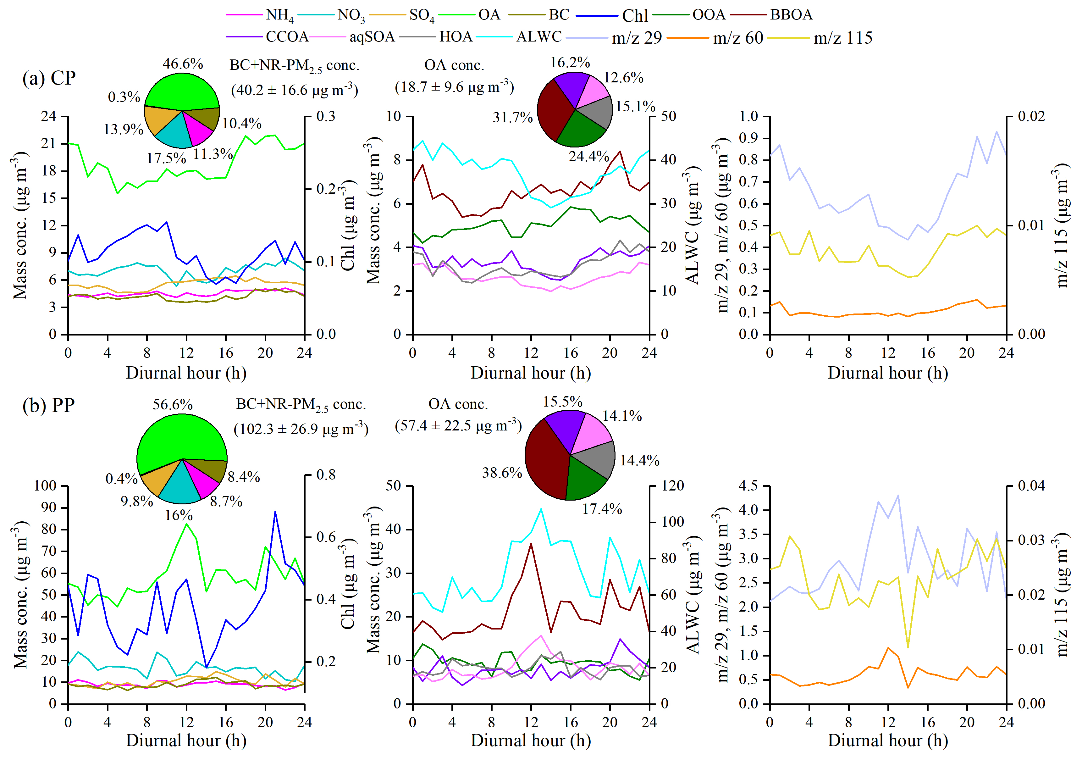 Figure 2Diurnal variations of PM2.5 species, BC, OA factors, 29, 60, and 115 mass concentrations during the (a) clean period (CP) (BC + NR-PM2.5 <75 µg m−3) and (b) pollution period (PP) (BC + NR-PM2.5>75 µg m−3). The pie charts on the left side of panels (a) and (b) show the average mass contributions of different chemical compositions to BC + NR-PM2.5 during CP and PP, respectively. Meanwhile, the average mass contributions of OOA, BBOA, CCOA, aqSOA, and HOA to OA are shown in the pie charts in the middle of panels (a) and (b), respectively.