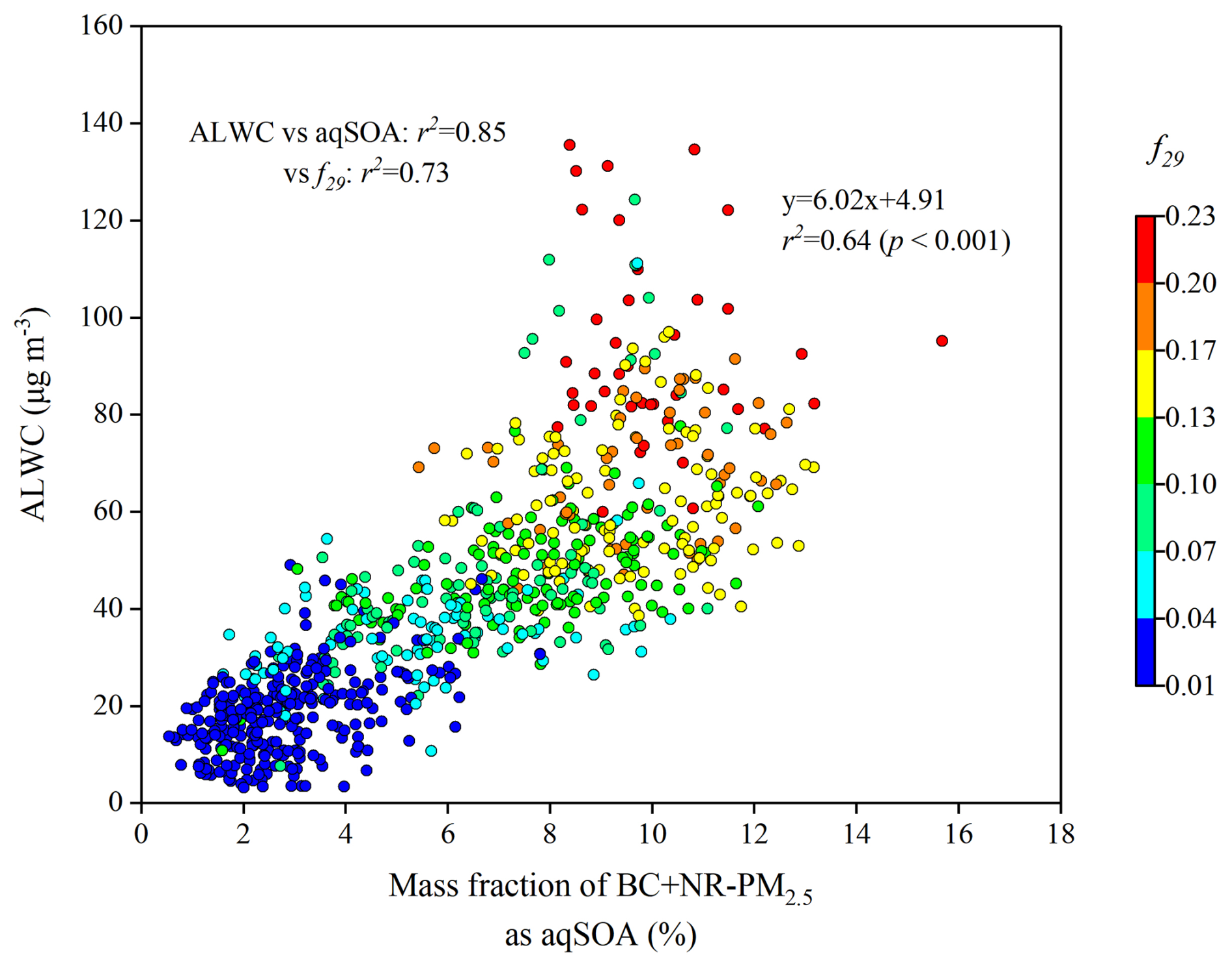 Figure 3Scatter plot of the mass fraction of aqSOA in BC + NR-PM2.5 versus ALWC, coloured by f29 (normalized signal at 29) during the campaign. f29 (mainly CHO+) is a tracer for alcohol compounds and is used to monitor the aqueous-phase oxidation of organic compounds, such as glyoxal.