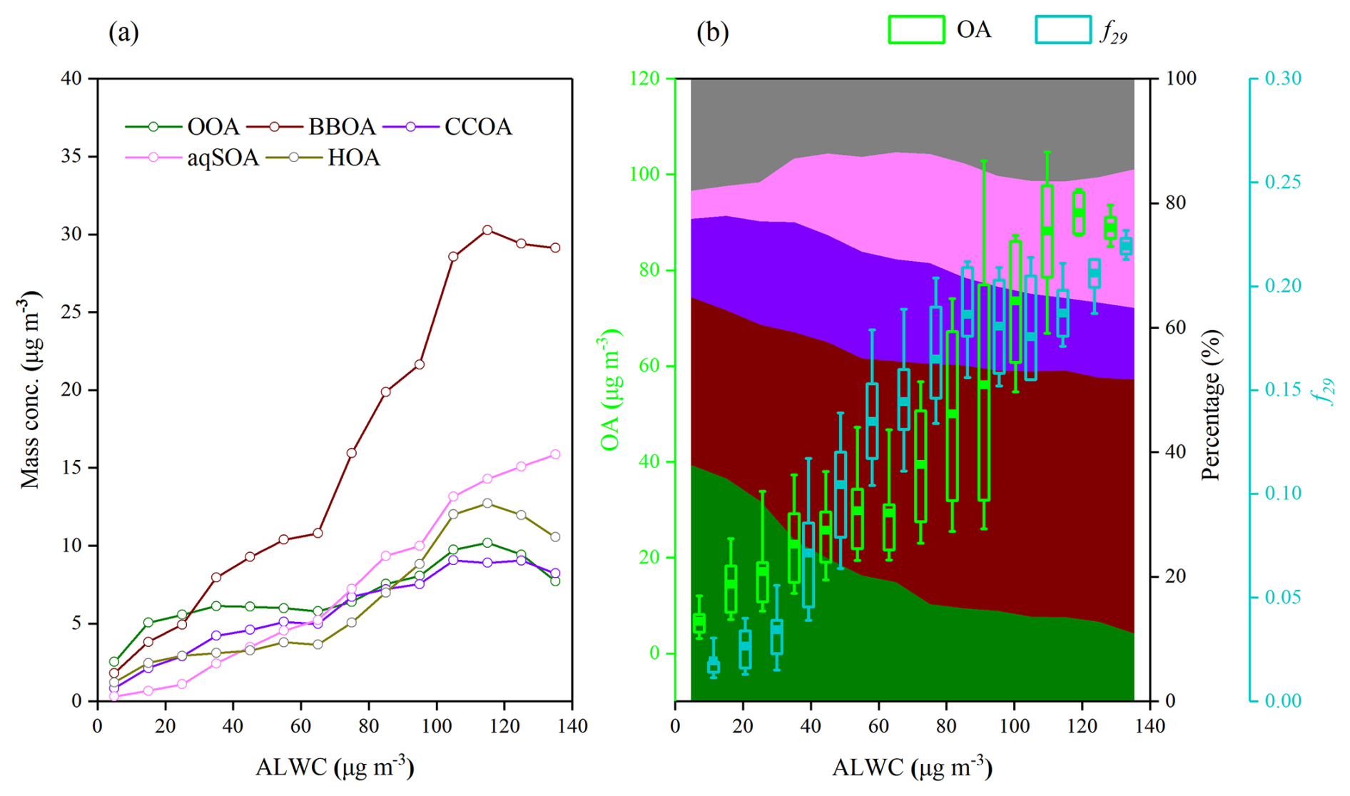 Figure 4Variations of (a) OA factor mass concentrations, (b) OA mass concentrations, f29 (a tracer for alcohol compounds), and mass fraction of OA factors as a function of ALWC. Data were grouped into different bins according to a 10 µg m−3 increment of ALWC.