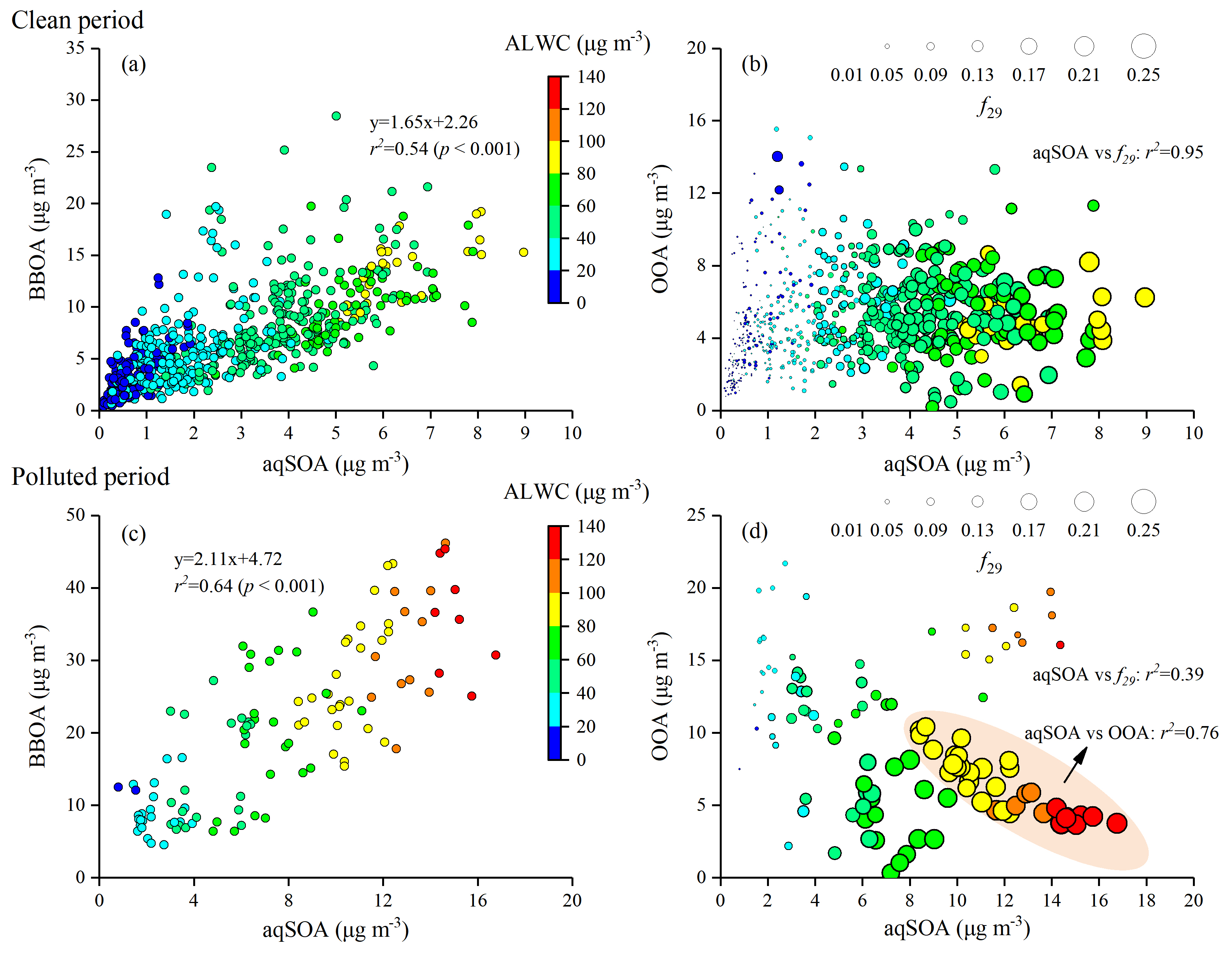 Figure 5Scatter plots of aqSOA versus (a, b) BBOA and (c, d) OOA mass concentrations, coloured by ALWC during CP and PP. The size of the symbols panel in (b) and (d) increases with the increase in the f29 value, which is a tracer for alcohol compounds.