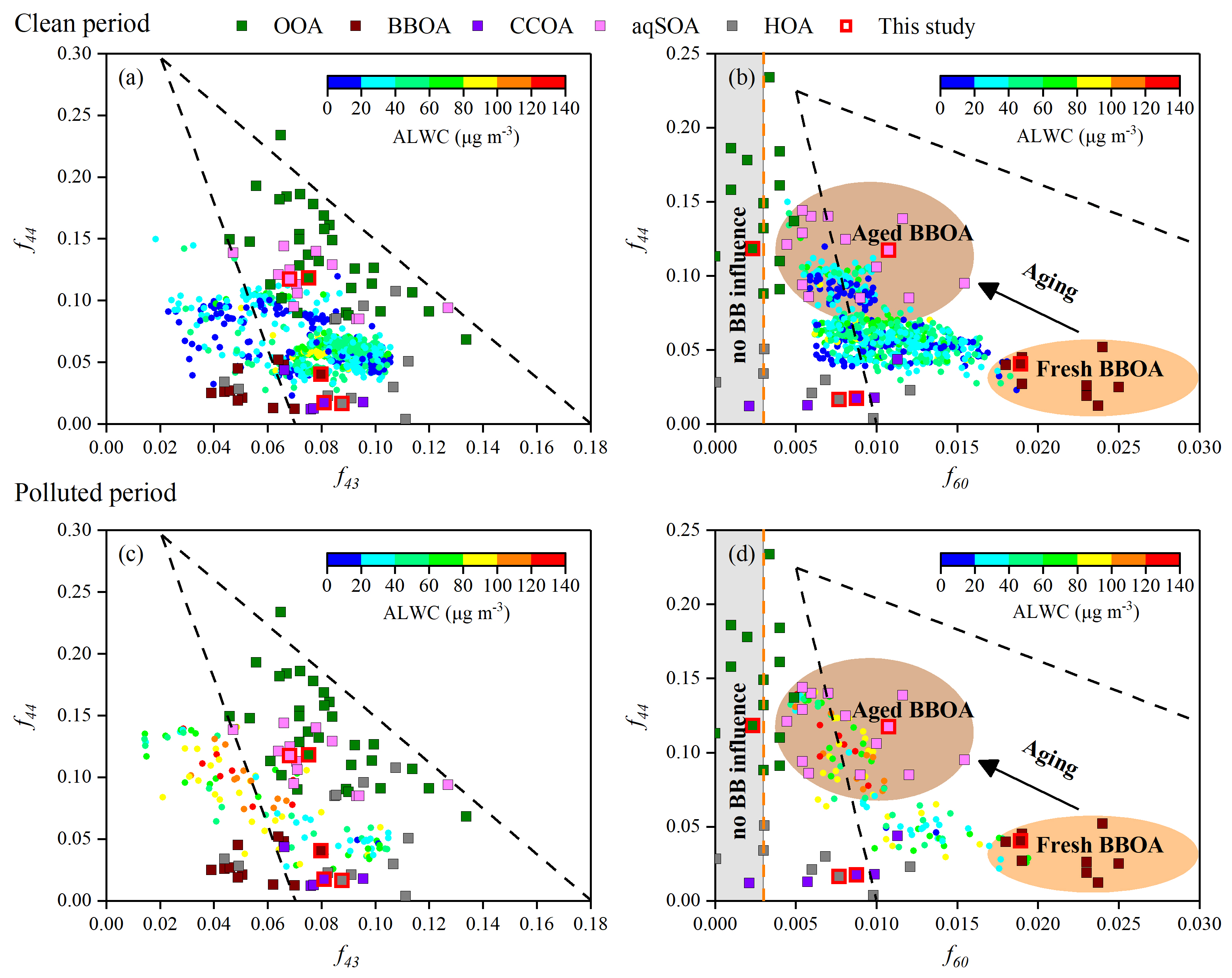 Figure 6Triangle plots of (a, c) f44 (normalized mass spectrum signal at 44) versus f43 (normalized mass spectrum signal at 43) and (b, d) f44 versus f60 (normalized mass spectrum signal at 60), coloured by ALWC (circles) during CP and PP. The dashed lines in (a) and (c) were derived from Ng et al. (2010) and used to follow the aging of OA components in the atmosphere. The background space (f60<0.003) without biomass burning influence is also shown by the grey shaded area. The background value of secondary aged OA (brown dashed line) and the black dashed lines characterizing the aging of BBOA in (b) and (d) were derived from Cubison et al. (2011). The data points (squares) included the measurements from this study (bordered in red) and previous research (Bao et al., 2023; Gilardoni et al., 2016; Kim et al., 2019; Ng et al., 2011a; Paglione et al., 2020; Xu et al., 2015, 2017, 2019; Zhao et al., 2017, 2019). f43 (mainly C2H3O+) is a tracer for POA and fresh SOA; f44 is a proxy of the OA oxygenation degree and used as a tracer for aged SOA; and f60 is a proxy of anhydrosugars emitted from biomass burning.