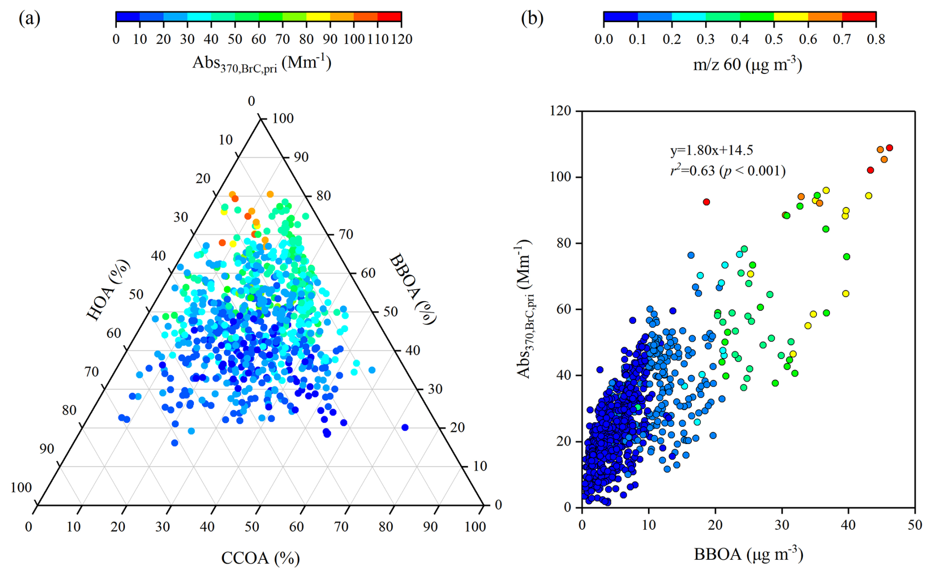 Figure 7(a) Ternary diagram for the mass fractions of BBOA, CCOA, and HOA in POA, coloured by Abs, and (b) scatter plot of BBOA mass concentrations versus Abs, coloured by 60 mass concentrations.