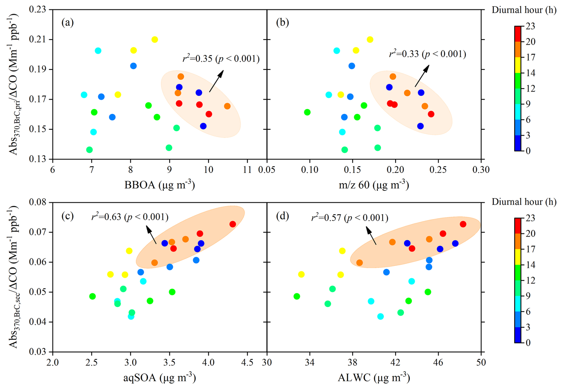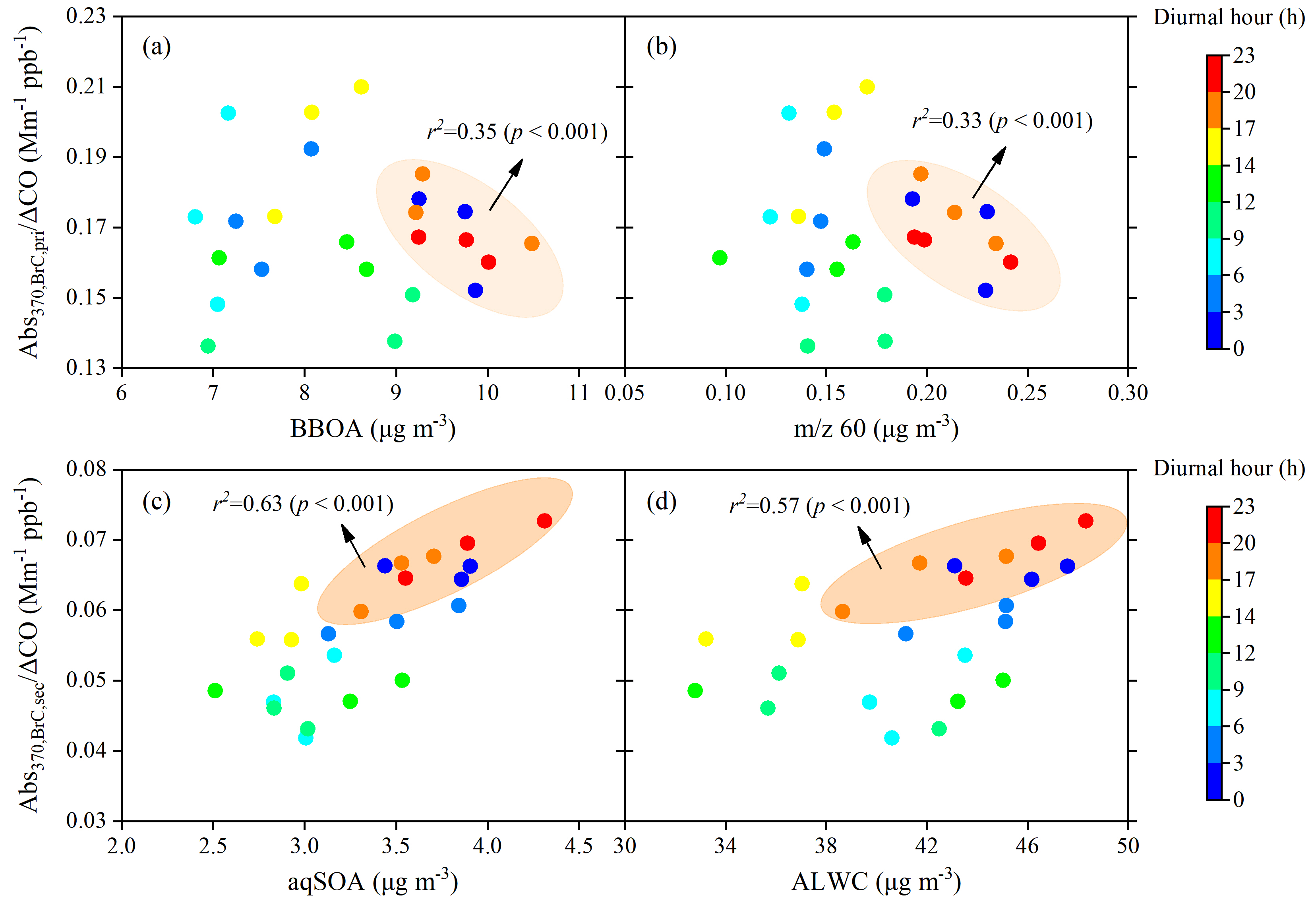 To further characterize the evolution of secondary BrC absorption, Abs was normalized by ΔCO (background-corrected CO mixing ratios) to minimize the effect of boundary layer height (Fig. 8) (DeCarlo et al., 2010). Here, the background CO value (400 ppb) was defined as the lowest 1.25th percentile of CO values during the campaign (Kondo et al., 2006). Figure 8 shows that the ratios of AbsCO increased with both aqSOA concentration and ALWC from 17:00 to 03:00 LT (r2=0.63, 0.57, p<0.001), whereas AbsCO decreased slightly with increasing BBOA and 60 concentrations over the same period (r2=0.35, 0.33, p<0.001). Additionally, the average concentrations of NO3, NH4, and NO2 from 17:00 to 03:00 LT (9.1 µg m−3, 5.6 µg m−3, and 16.0 ppb, respectively) were 1.2, 1.2, and 1.3 times those from 04:00 to 16:00 LT (7.7 µg m−3, 4.7 µg m−3, and 12.6 ppb, respectively). These results are consistent with previous winter observations in the SCB (Peng et al., 2025; Wu et al., 2024).