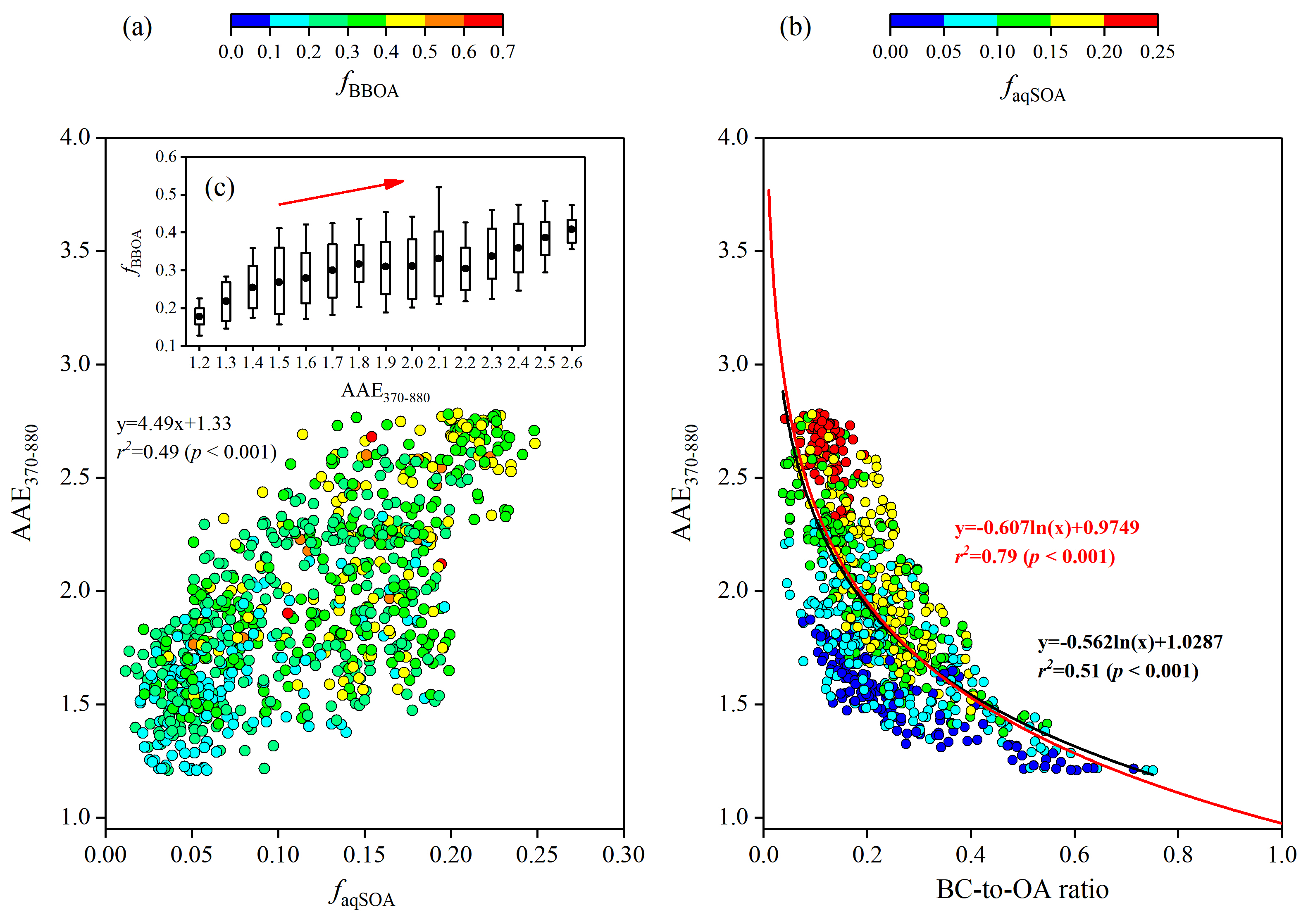 Figure 9Relationship between (a) AAE370–880 and the mass fraction of aqSOA (faqSOA= aqSOA/OA), coloured by the mass fraction of BBOA (fBBOA= BBOA/OA), and (b) BC-to-OA ratios coloured by faqSOA. (c) Variations of fBBOA as a function of AAE370–880. The red curve in (b) was the best fit curve to data taken from Lu et al. (2015) and described the Abs of fresh and aged BBOA.