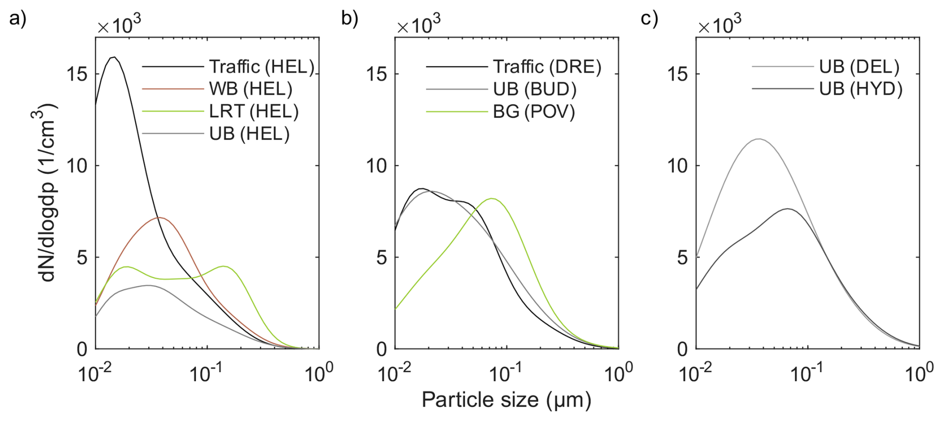 Figure 2Simulated particle number size distributions based on reported particle number size distributions measured in (a) Finland, (b) Central/Southern Europe and (c) India. UB (HEL), WB (HEL) and LRT (HEL) indicate data corresponding to g urban background, residential wood burning and a long-range transported episode in measurements by Teinilä et al. (2022) in Helsinki, respectively. Traffic data from Helsinki, urban background data from Budapest (BUD), traffic data from Dresden (DRE) and rural background (BG) data from Po Valley (POV) are based on study by Trechera et al. (2023). Urban background data from Delhi (DEL) and Hyderabad (HYD) are based on study by Sebastian et al. (2022).