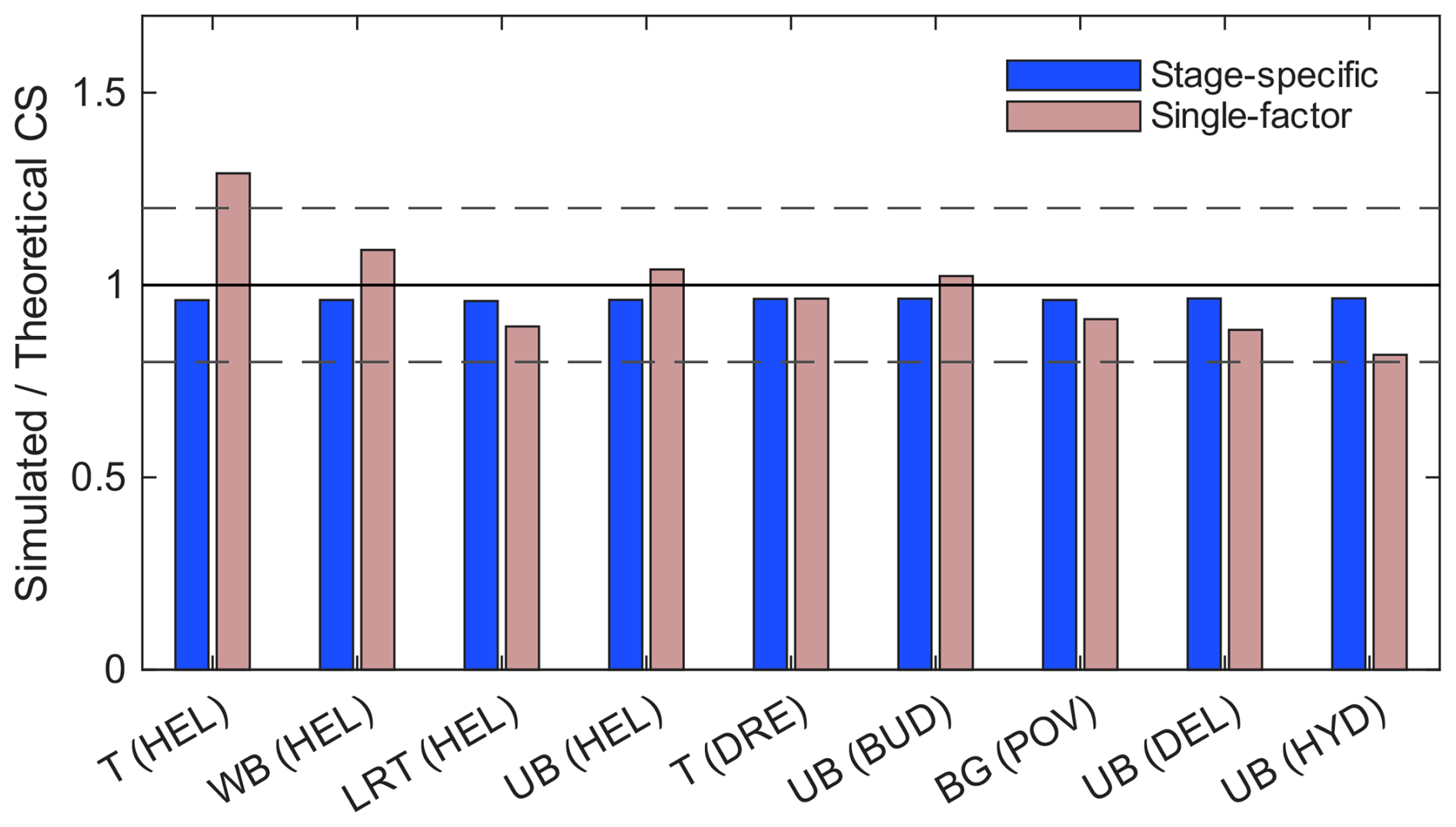 Figure 3Simulated total CS of the size distributions in Fig. 2 with both stage-specific and single-factor calibrations compared to the theoretical value. T indicates traffic site, whereas other abbreviations are the same as in Fig. 2. The shaded lines represent error limits of ±20 %.