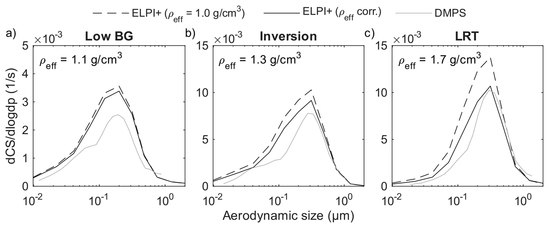 Second, to evaluate the effect of particle ρeff on the CS measurement, CS measurement of an ELPI+ and a DMPS were compared based on data measured in a street canyon in Helsinki in winter 2022 (Lepistö et al., 2024; Teinilä et al., 2025). The CS from the DMPS data was calculated with the same approach as for the ELPI+ (Eq. 2). The data were divided into three categories based on conditions: (1) low regional background concentration, (2) temperature inversion, (3) long range transported (LRT) episode. Average PN, PM2.5, NO and black carbon concentrations of these periods are collected in the Supplement (Table S2). Most importantly, the average ρeff was different during the periods, and the ELPI+ CS measurement was compared to DMPS by assuming unit density but also by correcting the measurement by using the estimated average ρeff of the periods based on Eq. (8). The average ρeff was estimated by comparing the peak sizes of particle surface area size distributions of the DMPS and ELPI+ (see Lepistö et al., 2024). In the analysis, all the particles were assumed to have the same ρeff even though, in reality, ρeff has size-dependent and temporal variation. However, the cascade impactor measurement of the ELPI+ fundamentally challenges the use of size-dependent values for ρeff. In addition, the measured ELPI+ data in different countries and locations (Sects. 2.4 and 3.2) were converted into CS by using varying ρeff values from 0.8 to 1.5 g cm−3 to see how ρeff changes the measured total CS and the size distribution. According to many studies, ρeff of ultrafine particles is typically near 1.0 g cm−3 whereas for larger accumulation mode particles ρeff can be around 1.5–1.8 g cm−3 (e.g., Levy et al., 2013; Yin et al., 2015; Lu et al., 2024). The relationship between the particle mobility equivalent diameter (dm) and the aerodynamic diameter (da) can be calculated from
