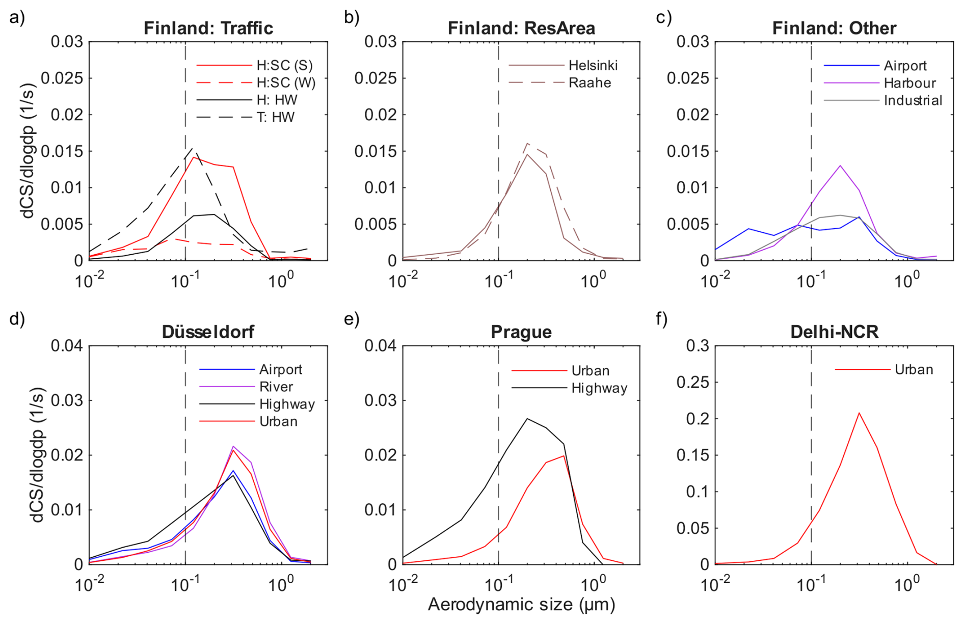 Figure 5The average CS size distributions in the studied environments, including (a) road traffic sites in Finland, (b) detached-housing residential areas in Finland, (c) airport, harbour and industrial areas in Finland, (d) various urban micro-environments in Düsseldorf (e) road traffic sits in Prague and (f) urban site in Delhi-NCR. The dashed line represents the size of 100 nm. Note varying y axis. H and T indicate Helsinki and Tampere, respectively, whereas SC and HW indicate, street canyon and highway. Urban indicates an urban traffic site and ResArea a residential area.