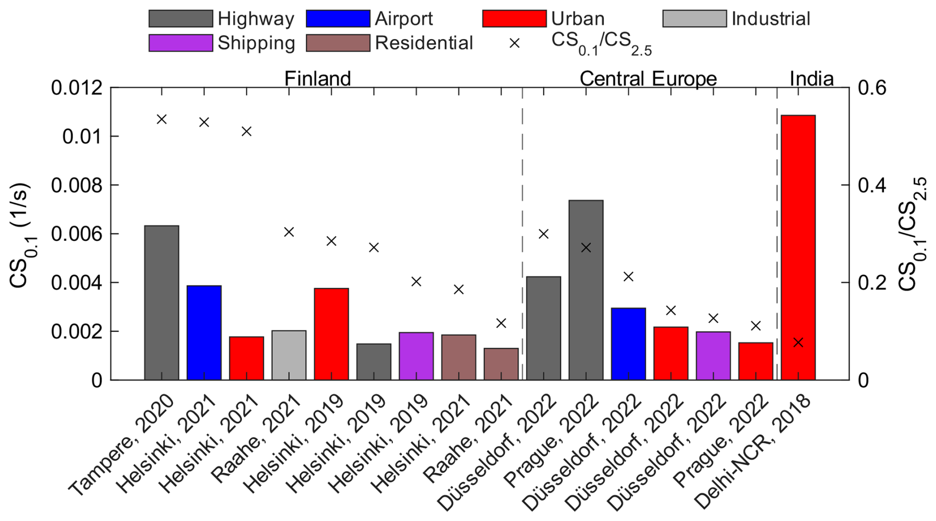 Briefly, the comparison of CS measurement between the DMPS and ELPI+ was done in a street canyon located in the city centre of Helsinki (60.1963° N, 24.9523° E) on 18 January–16 February 2022. During the measurements, contribution of regional aerosol was mainly low, but on 31 January–5 February an inversion episode, and on 13–16 February a long-range transported (LRT) pollution episode affected the measured aerosol, e.g., in terms of effective density and average particle size, enabling comparison of the methods with different aerosol characteristics. All the other campaigns were conducted next to a certain urban aerosol source (road traffic, shipping, airport, detached housing residential area or industrial area). The focus of the campaigns was to study the characteristic aerosol emissions of the studied sources. Hence, the measurements were targeted to be conducted when the measurement sites were clearly affected by the targeted emission source. For example, near the airports, only downwind periods are considered in the results (see Table S3). Therefore, the presented results should not be considered to represent long-term aerosol characteristics in the studied location. In these measurements ρeff was set to 1.0 g cm−3 and CS was measured up to size 2.5 µm. Also, CS attributable to ultrafine particle (CS0.1) was estimated by summing the CS obtained from the impactor stages 1–4. The upper 50 % cut-off size of the stage 4 was 95.7 nm.