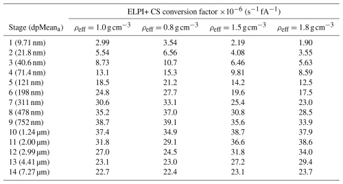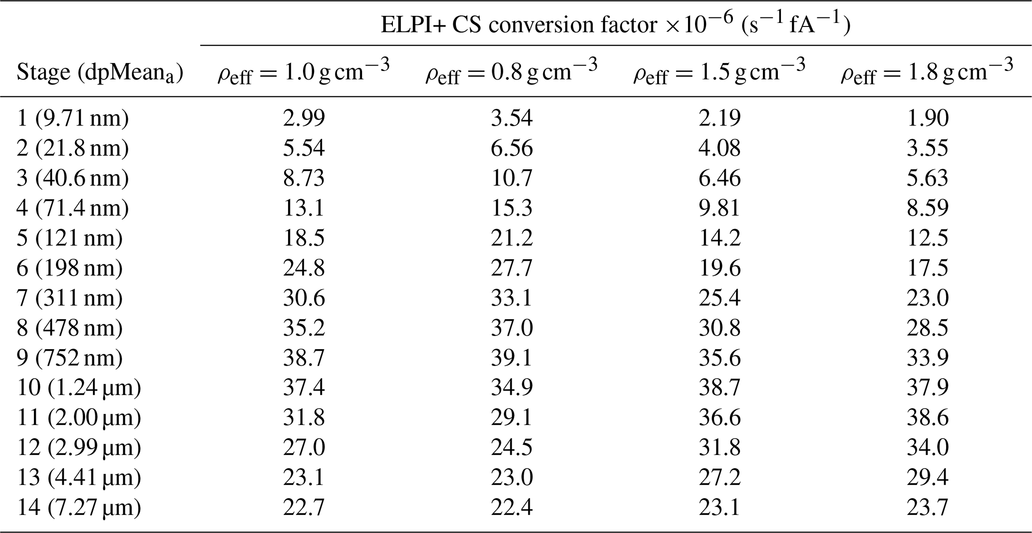 Table 1ELPI+ CS conversion factors from electric current to CS for different stages with four different particle effective densities for the unit used in this study. The dpMeana indicates the nominal mean particle size of collected particles on each impactor stage, represented as the aerodynamic diameter.