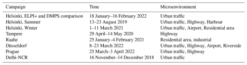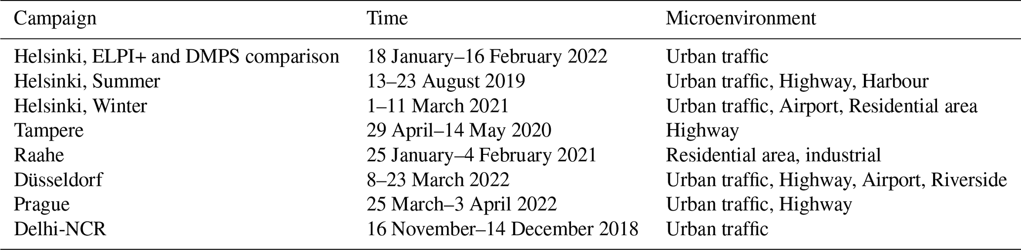 Our study utilises data from eight measurement campaigns conducted in Helsinki (Finland), Tampere (Finland), Raahe (Finland), Düsseldorf (Germany), Prague (Czechia) and Delhi-NCR (India) in 2018–2022. These campaigns are listed in Table 2, and brief descriptions of the campaigns are provided in Table S3. Data from seven of the campaigns have been utilised in a study where particle lung deposited surface area (LDSAal) concentrations and size distributions were compared by Lepistö et al. (2023), and the same dataset is utilised also in this study. In addition, data from the measurement campaign conducted in Helsinki during winter 2022 (Lepistö et al., 2024; Teinilä et al., 2025) were utilised in the comparison of DMPS and ELPI+ CS measurement.