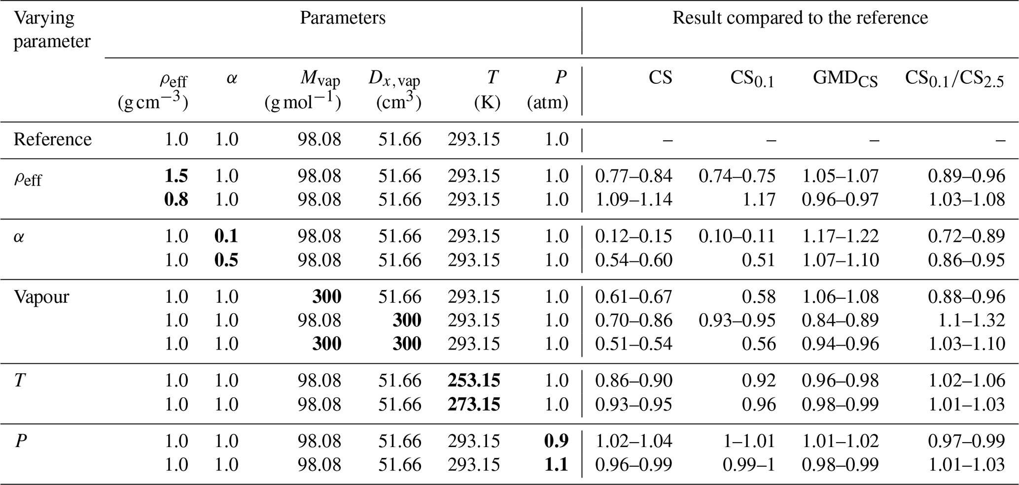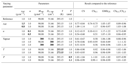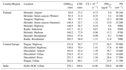 Table 3Relative differences of the measured CS, CS0.1, GMDCS and values at the studied locations of Highway (Tampere), Airport (Düsseldorf) and Urban (Delhi-NCR) when altering input parameter values of the calculation (ρeff, α, Mvap, Dx,vap, T, P). The reference indicates the default input parameter values utilised in this study, and the results compared to reference shows the obtained values (of all three locations) divided by the reference result. Bold indicates values that were changed compared to the reference.