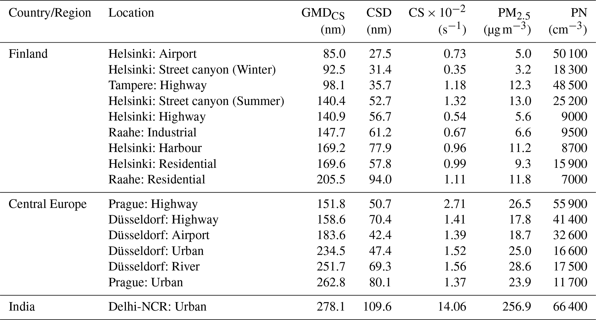 In Fig. 5, the average CS size distributions measured at all the studied environments (except the ELPI+ and DMPS comparison campaign) are shown (see Fig. S15 for the observation ranges of the CS size distributions). In Table 4, geometric mean diameters (GMDCS) of the CS size distributions together with CS diameter (CSD, Lehtinen et al., 2003), as well as total CS, PM2.5 and PN are collected. In principle (in case of a log-normal size distribution), the GMDCS represents the diameter of a particle that roughly 50 % of CS is contributed by particles smaller and larger than the GMDCS size. The CS diameter, on the other hand, represents the diameter of monodisperse aerosol particles that would contribute to equal total CS if the total number of the monodisperse particles was the same as the measured PN concentration. In Fig. 5, CS size distributions clearly varied depending on the environment. In locations, where ultrafine particle concentrations were high (road traffic sites, airport), GMDCS sizes were considerably smaller compared to other sites, being below 100 nm near airport and road traffic in Finland. GMDCS of below 100 nm indicates that vapour molecules condense onto ultrafine particles more likely than on accumulation mode particles (larger than 100 nm), which may be important e.g., in terms of particle lung deposition or in the formation of CCN nuclei. As PM2.5 concentrations increased, also the CS size distributions shifted to larger sizes in terms of both GMDCS and CSD values. In Finland, GMDCS sizes were 85–206 nm, whereas in Central Europe and India, 152–263 nm and 278 nm, respectively. Mostly, GMDCS sizes were between 150–300 nm.